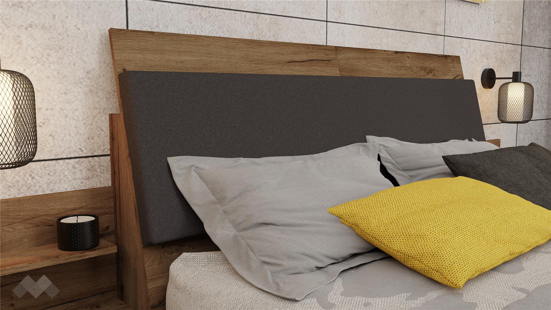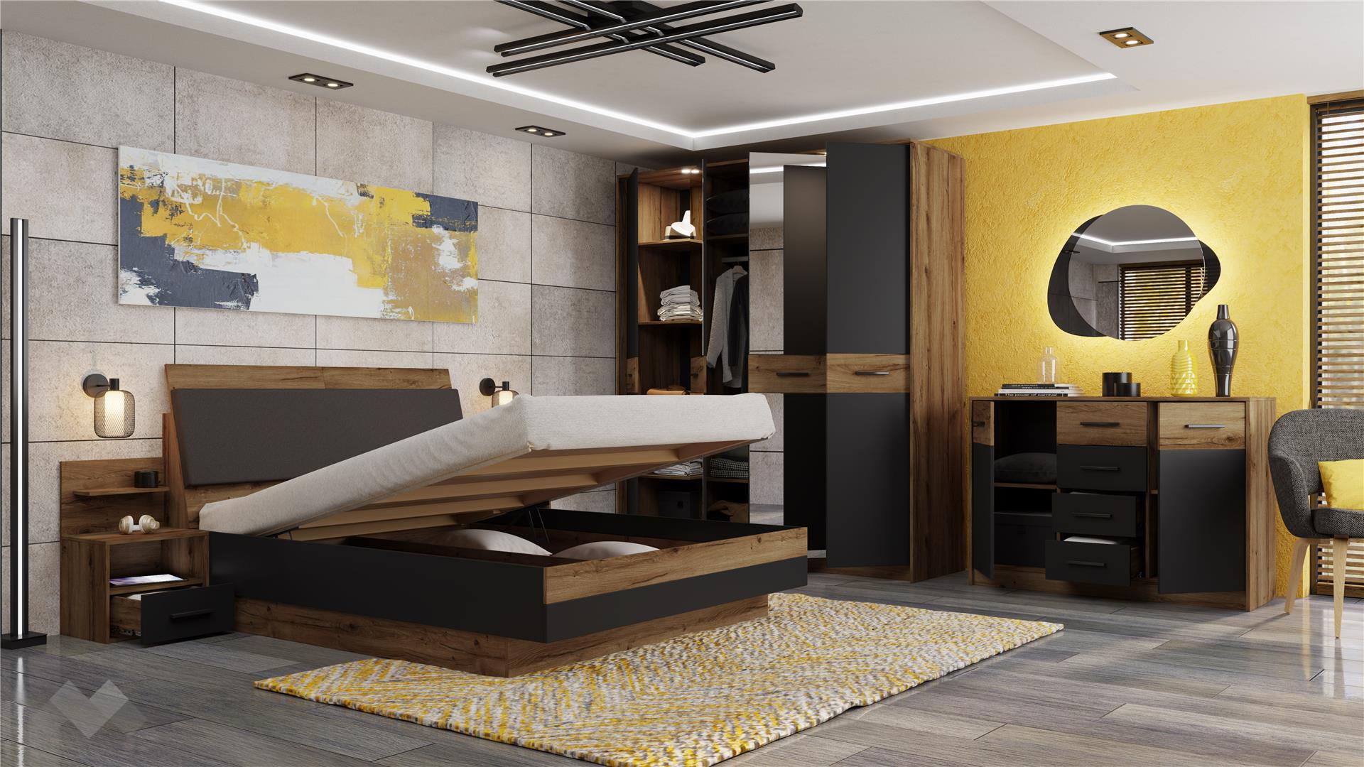 Спалнята е с висока табла с тапицирана част, която е идеална за почивка с книга преди сън или да погледаш филм. Двете нощни шкафчета са изключително функционални - имат малък рафт и плот на оптимална височина, за да може всичко което ти е необходимо да е на една ръка разстояние. Подходяща е за матрак с размер 160/200 и е с включен механизъм за повдигане на матрака, за да използваш максимално пространството под нея.