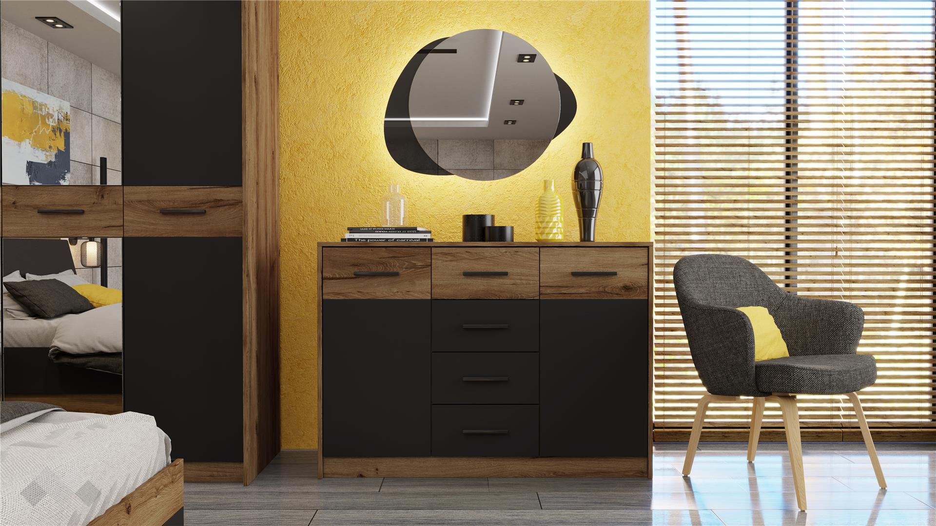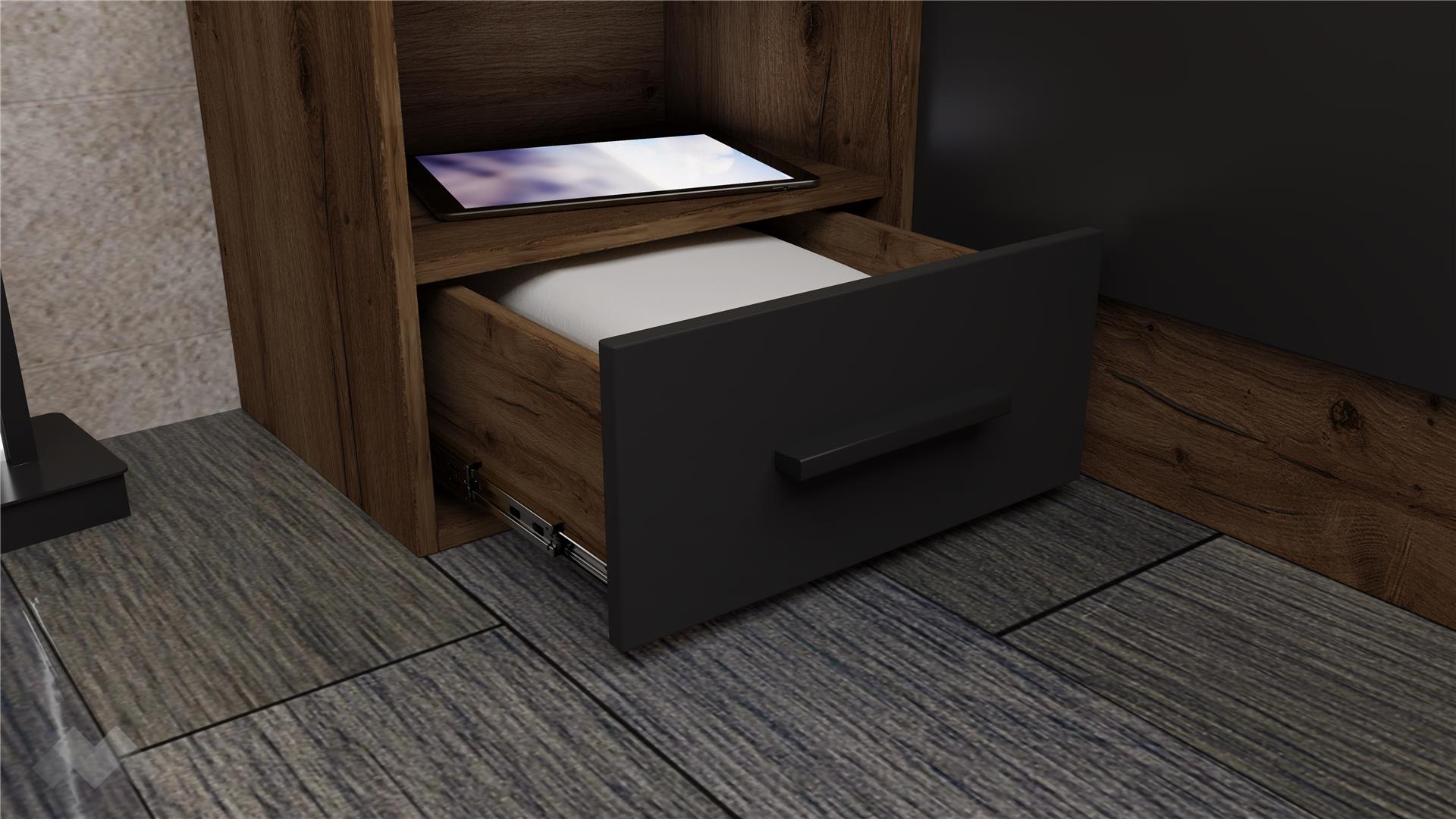 Превърни спалнята си в съвременно бягство с елегантен спален комплект Легрия, който съчетава кафяв дъб пиемона и черно шагре. Модерната композиция, допълнена с контрастиращи текстури, придаващи на интериора характер, стил и усещане за уют.