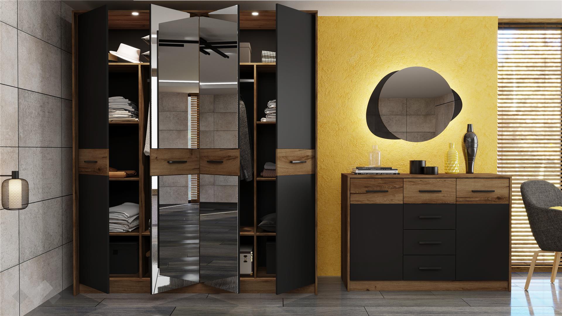 Гардеробът е четирикрилен с две огледални врати, с два лоста за закачалки зад тях и дванадесет рафта, за да организираш всички дрехи. Предимството на гардероба е включеното LED осветление - за да намериш необходимото по-лесно и бързо.