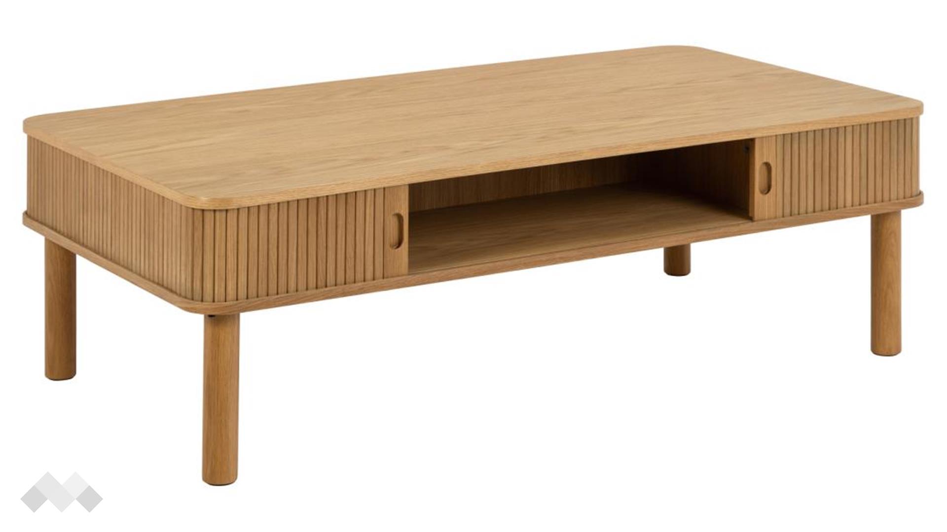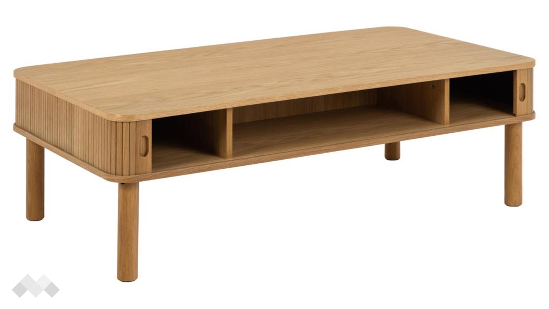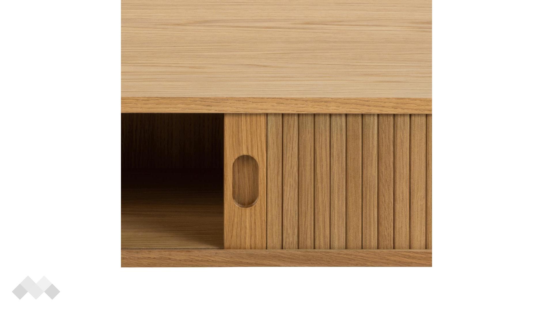 Функционалността на масата се разкрива чрез интелигентно проектираните ѝ детайли – отвореното отделение е идеално за съхранение на книги, списания или дистанционни, а плъзгащата се врата предоставя дискретно пространство за лични вещи. Заоблените ъгли не само придават стилен завършек, но и правят масата по-безопасна, особено в домове с деца.