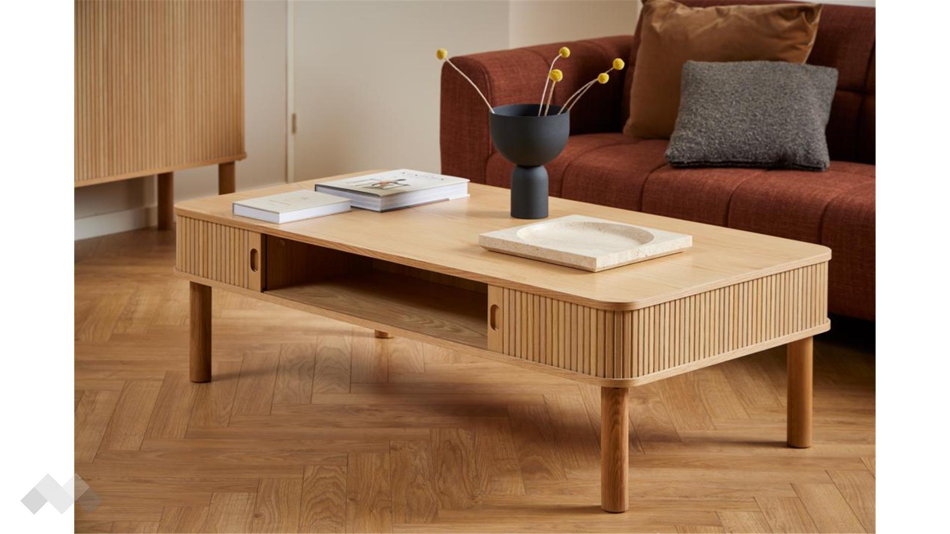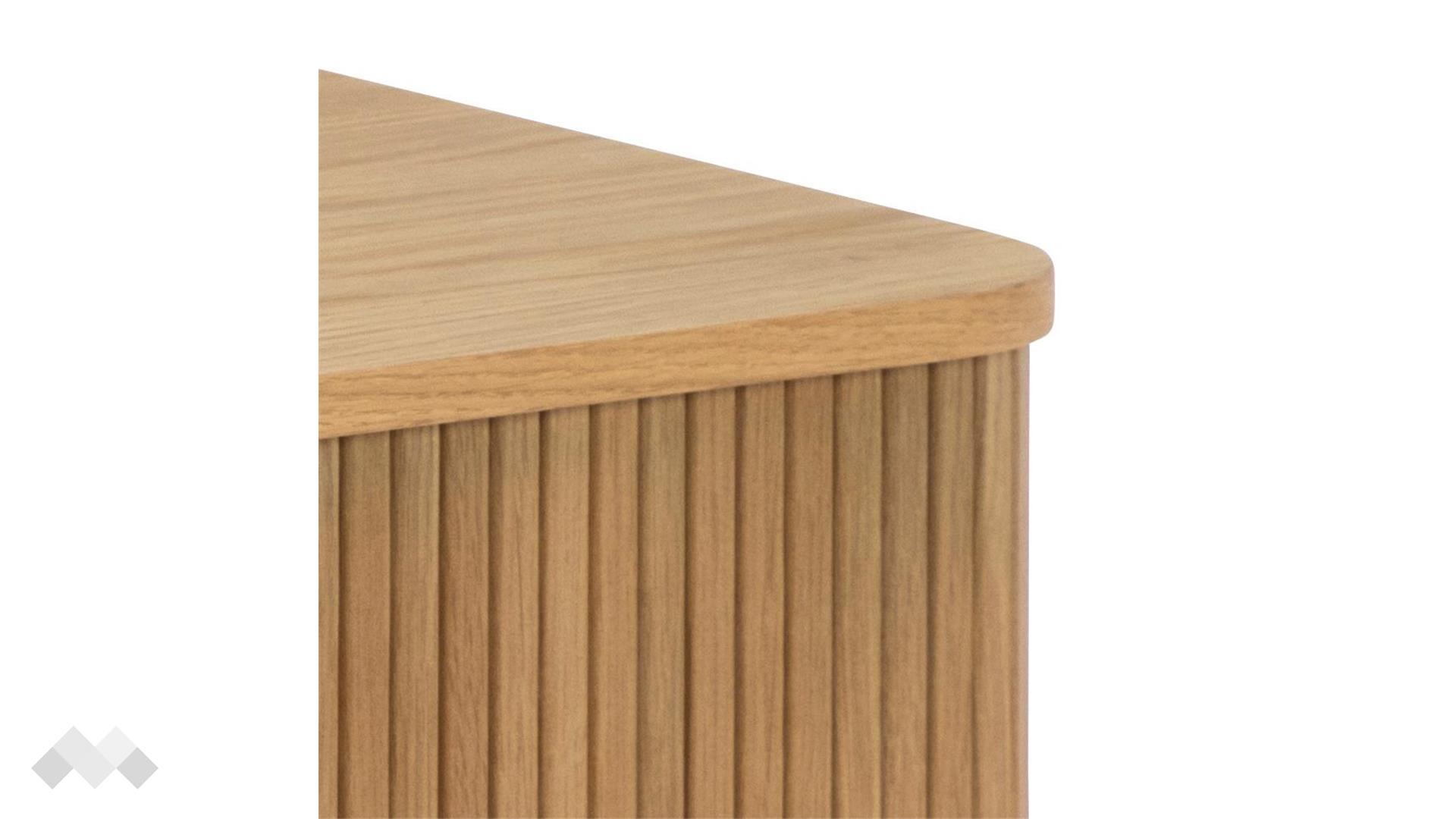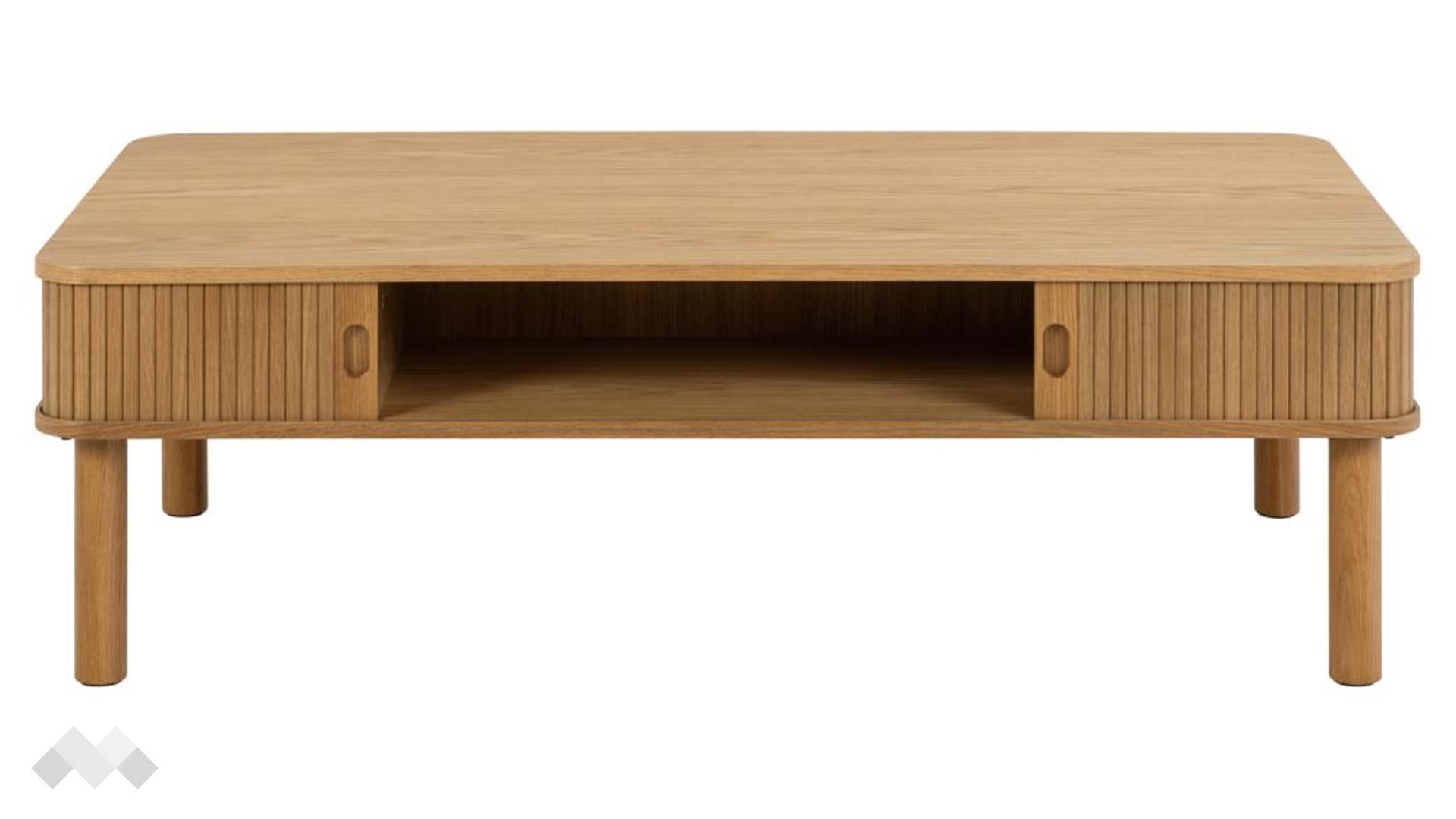 Функционалността на масата се разкрива чрез интелигентно проектираните ѝ детайли – отвореното отделение е идеално за съхранение на книги, списания или дистанционни, а плъзгащата се врата предоставя дискретно пространство за лични вещи. Заоблените ъгли не само придават стилен завършек, но и правят масата по-безопасна, особено в домове с деца.