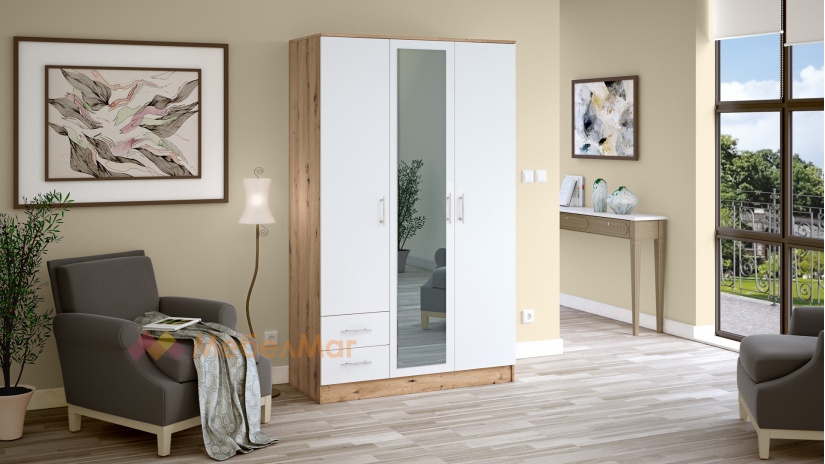 ⭐ Предимства: ✓ трикрилен ✓ 2 чекмеджета ✓ 4 рафта ✓ огледало ✓ лост за закачалки ✓ модерен декор ✓ практично разпределение ✓ качествена изработка ✓ 16 мм ПДЧ