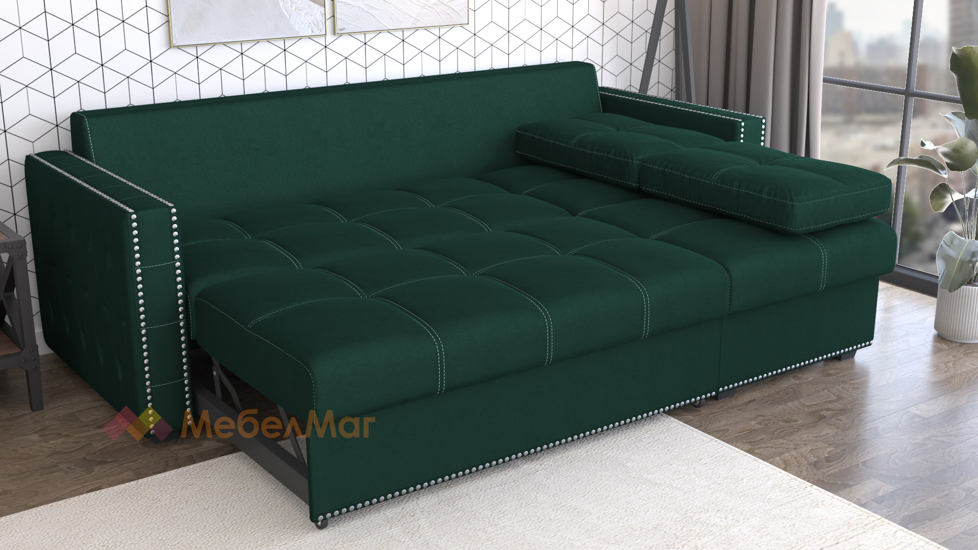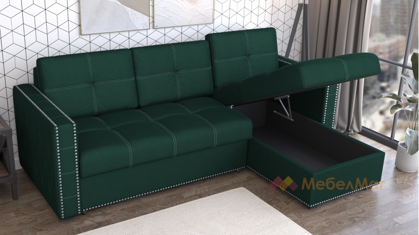 Диванът разполага с изтеглящ се механизъм за сън, който разкрива спална площ в размер 126/196 см. Под лежанката ще намериш ракла, в която да съхраняваш възглавници, завивки или други вещи, които да не заемат излишно място в твоя дом.