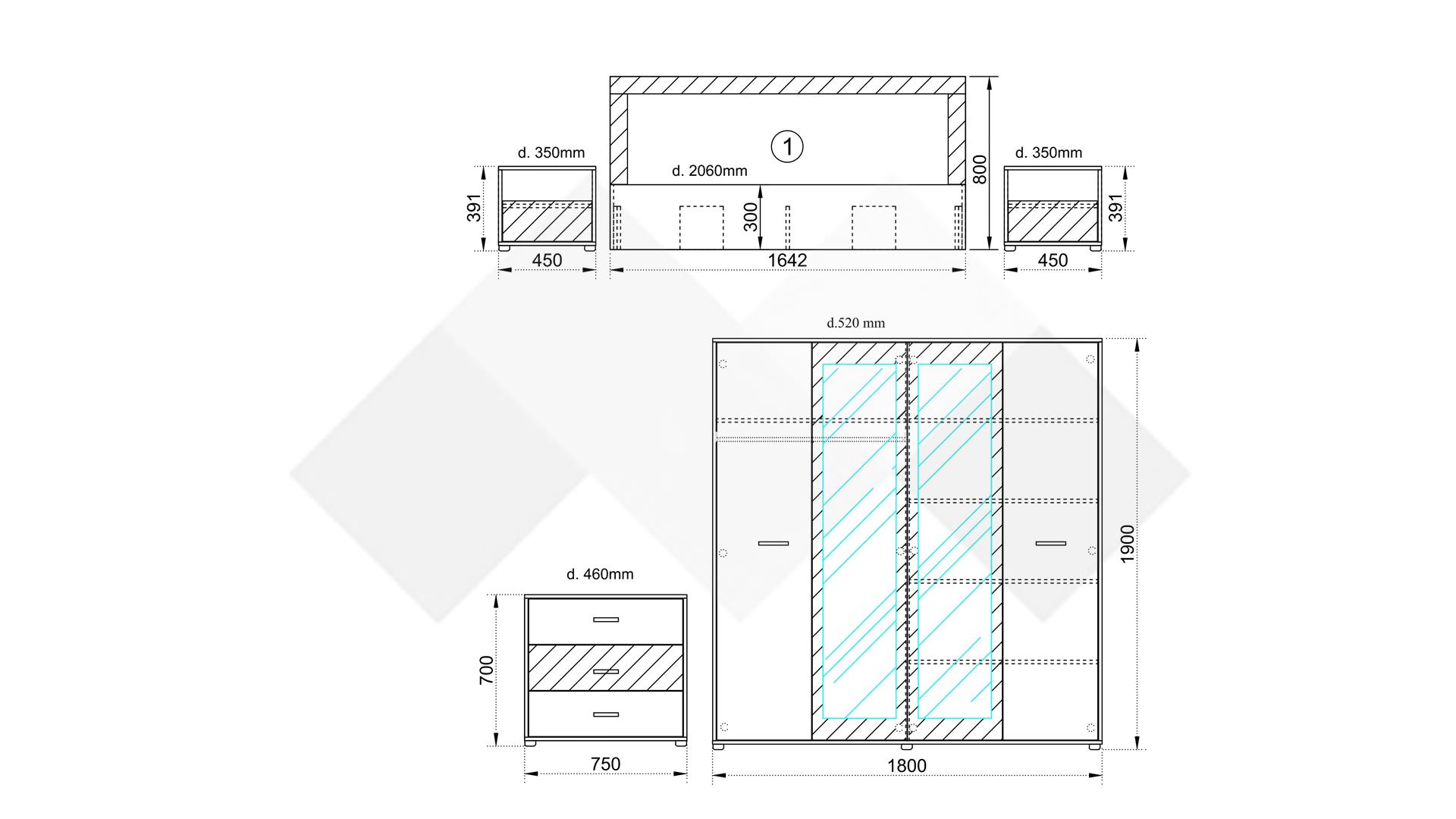 Спален комплектът Летисия е изработен от качествен 16 мм ПДЧ материал с висока здравина, гарантираща дълга експлоатация. Скринът, гардеробът и нощните шкафчета са с пластмасови крачета, а сребристите дръжки са удобни за хващане и добавят елегантен завършек.