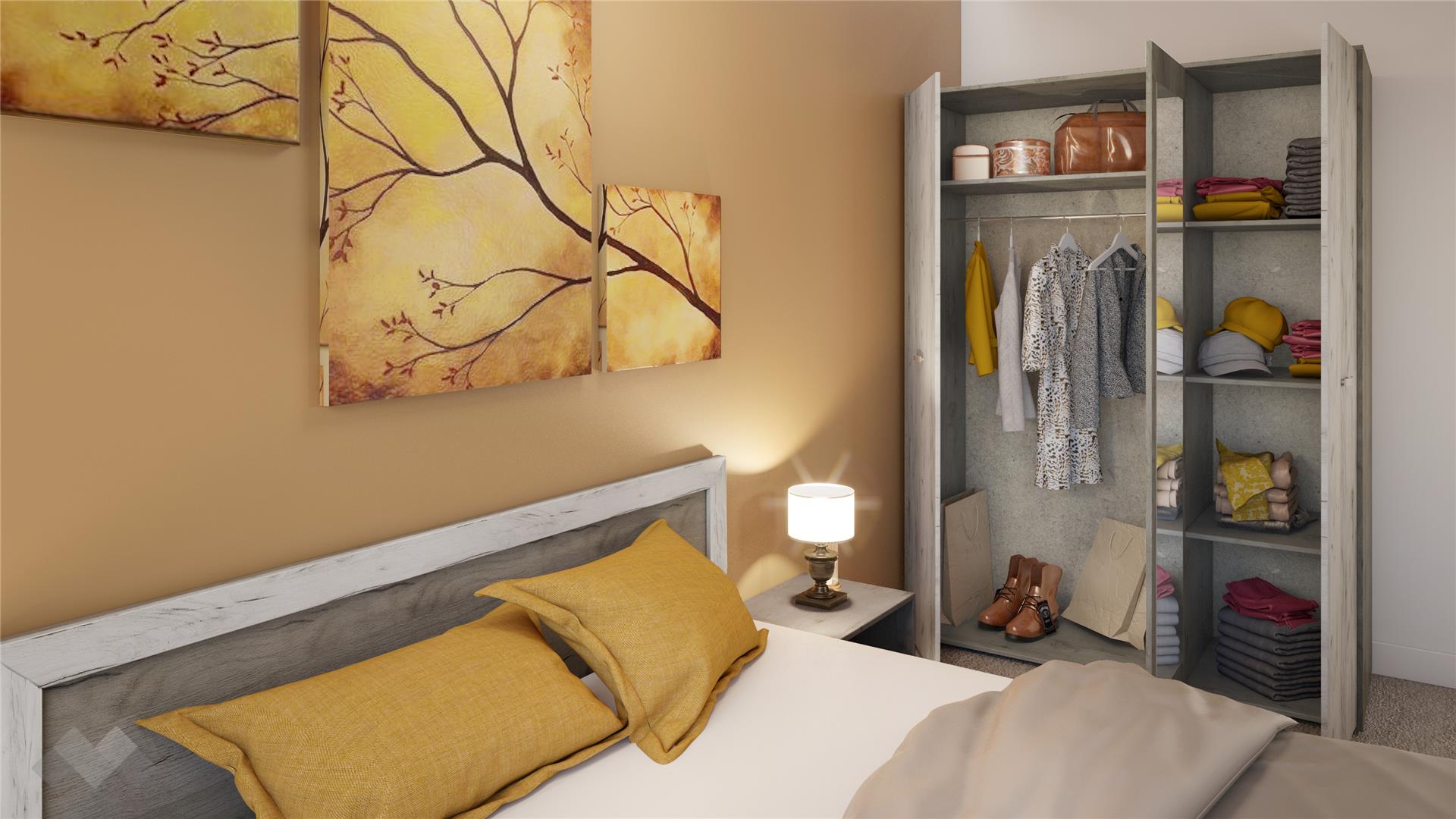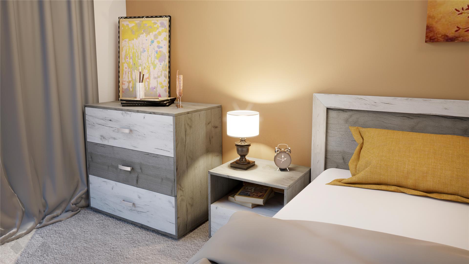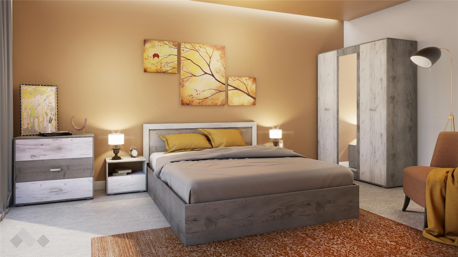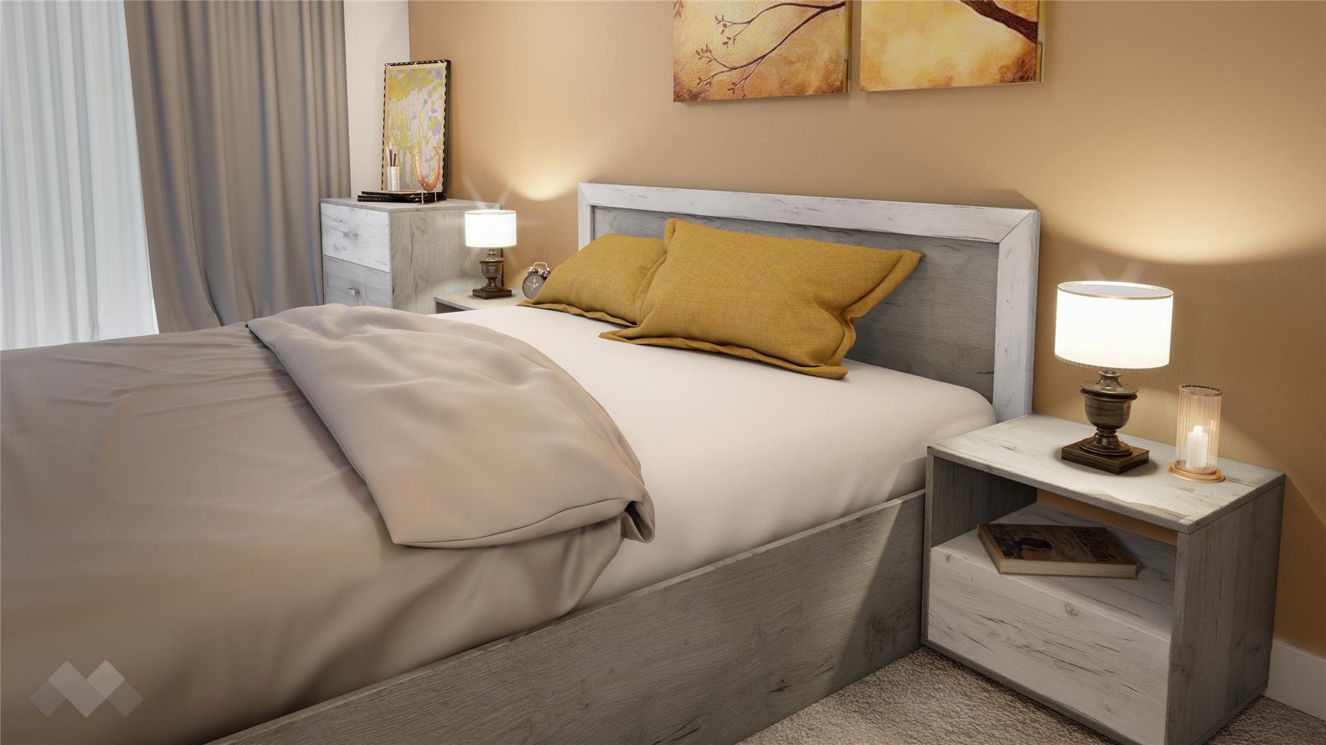 Спалнята е с размер 160/200 см, осигурява пространство и комфорт, а двете нощни шкафчета са удобно място да разположиш нощна лампа или просто да оставиш книгата, която четеш, без да ставаш от леглото.
