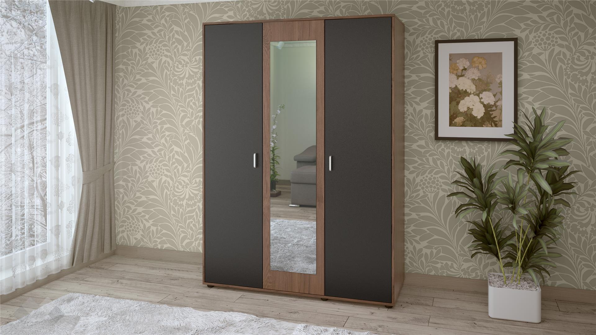 Гардеробът е достатъчно голям, за да побере всичките ти дрехи и предлага практично разпределение с 4 рафта и лост за закачалки, така че да подредиш всичко лесно. Монтираното на вратата огледало дава удобство при избора на тоалет и визуално прави стаята по-голяма и светла.