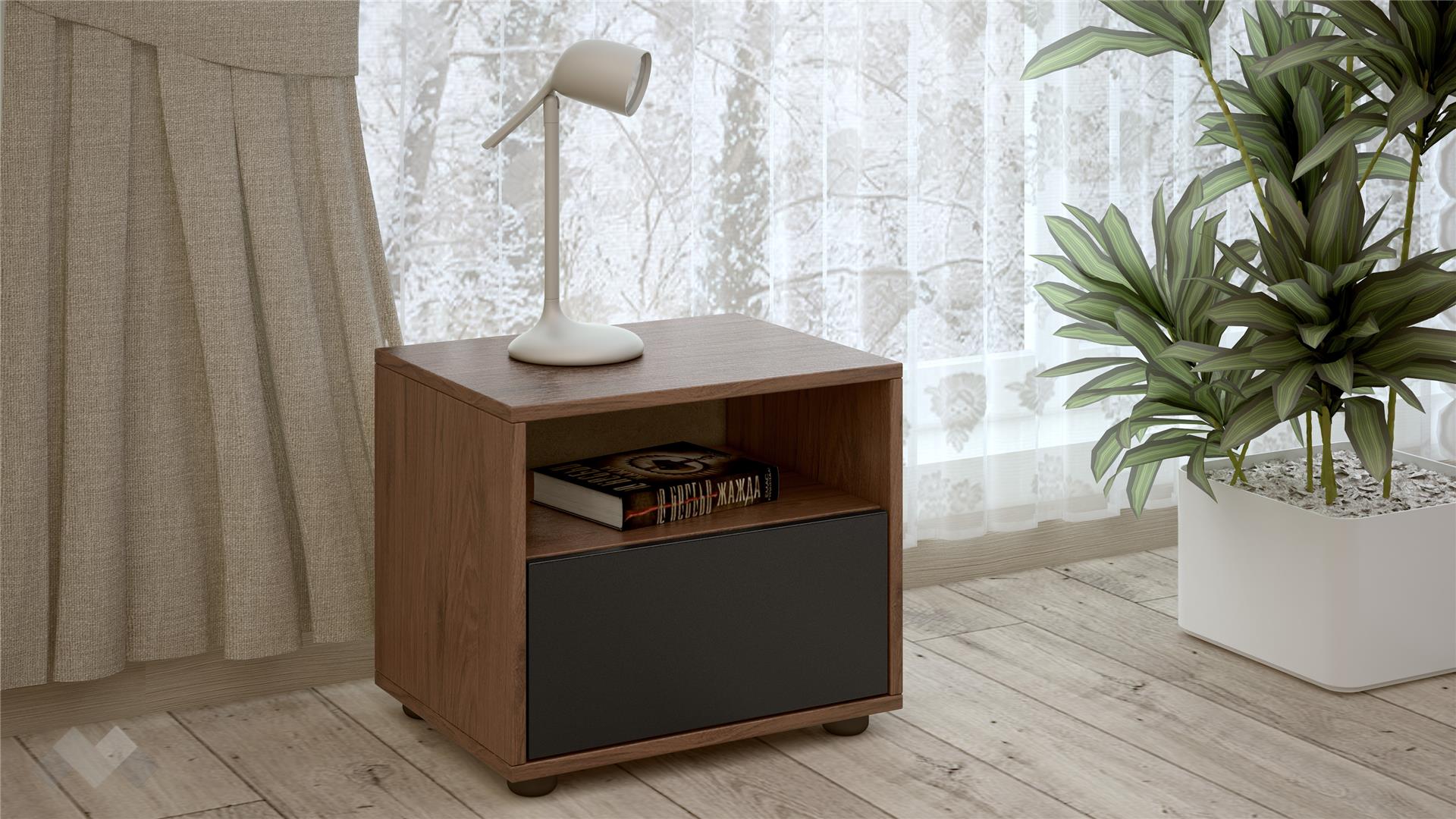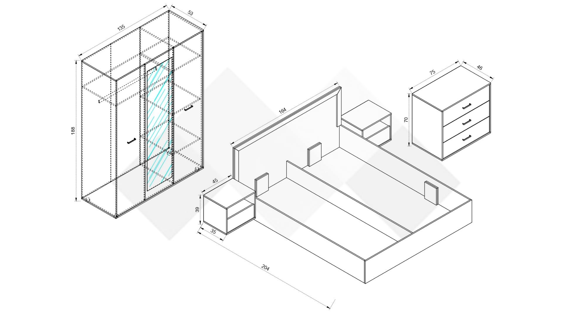 Спалнята е подходяща за матрак с размер 160/200 см, осигурява пространство и комфорт, а двете нощни шкафчета са удобно място да разположиш нощна лампа или просто да оставиш книгата, която четеш, без да ставаш от леглото.