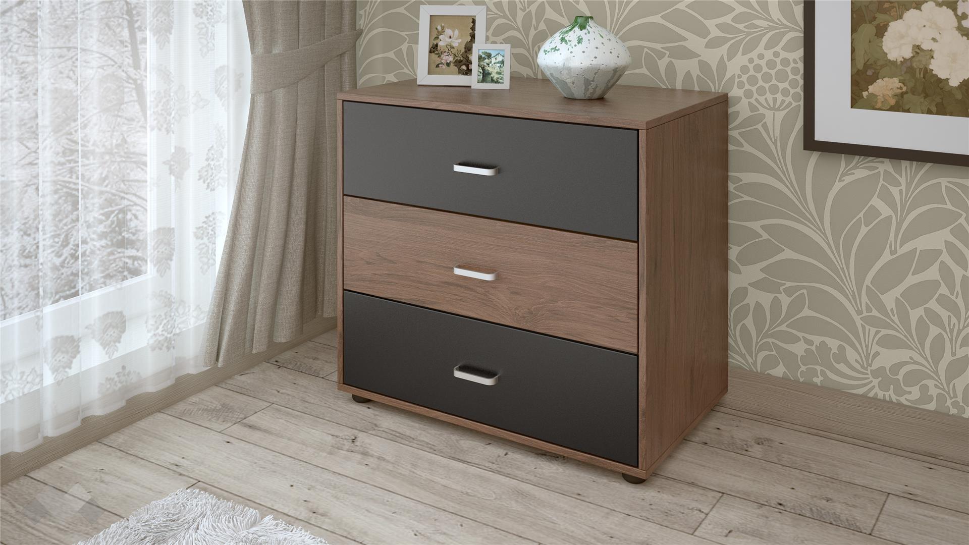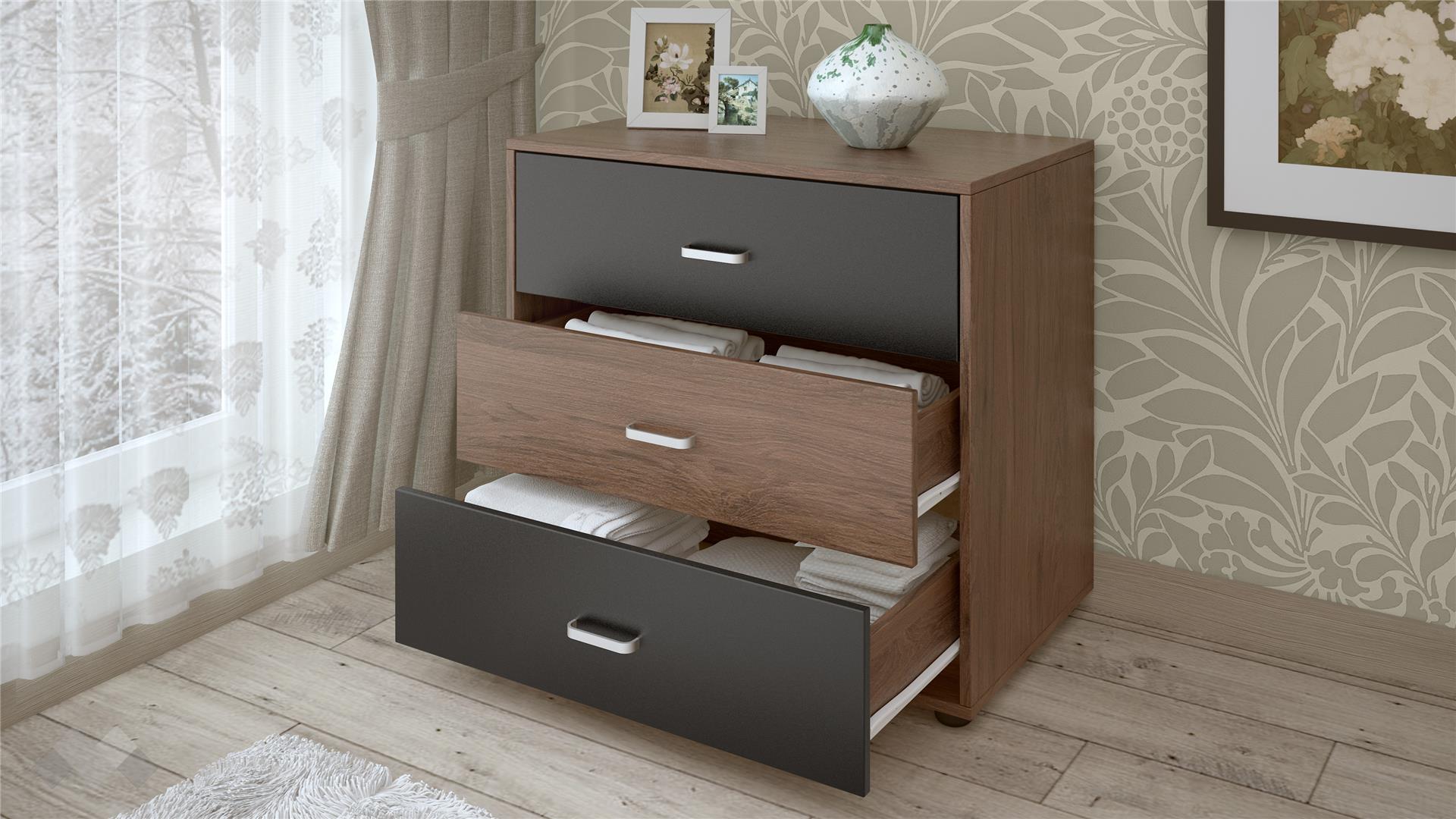 Елегантният скрин има три големи чекмеджета и плот, достатъчно голям да подредиш козметика. Подходящ е за допълнително съхранение и може да намери място във всяка стая.