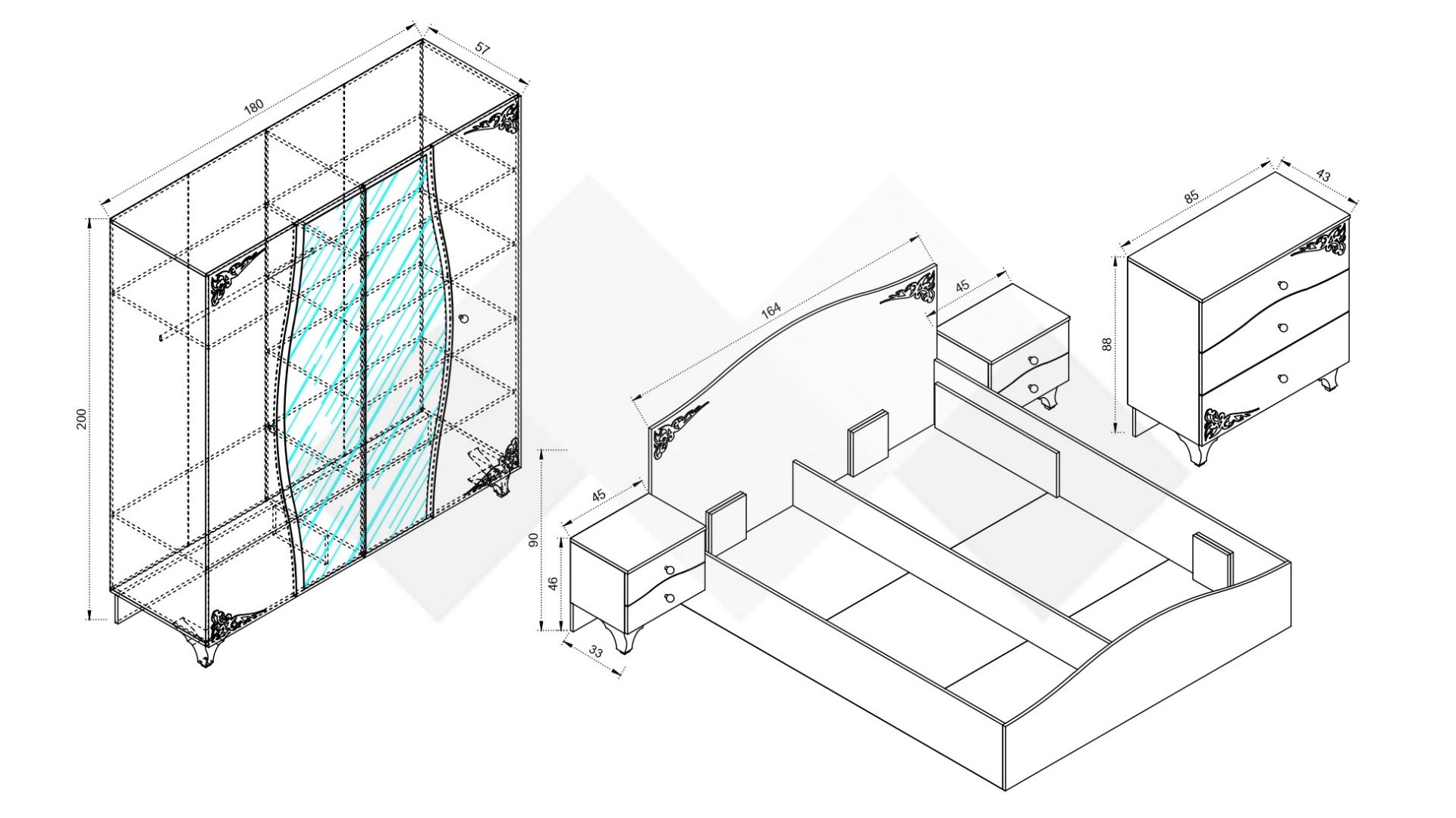 Гардеробът е четирикрилен, с огледални врати, които визуално разширяват пространството и създават повече светлина в помещението. Разполагаш с четири рафта, за да отганизираш сгънати дрехите си от едната и два от другата му страна, и лост за закачалки, за якета и палта. Декориран е със златни орнаменти в същия стил като леглото, което гарантира цялостна хармония в интериора. Осигурява достатъчно пространство за подредба на дрехи и аксесоари, комбинирайки функционалност и елегантност.