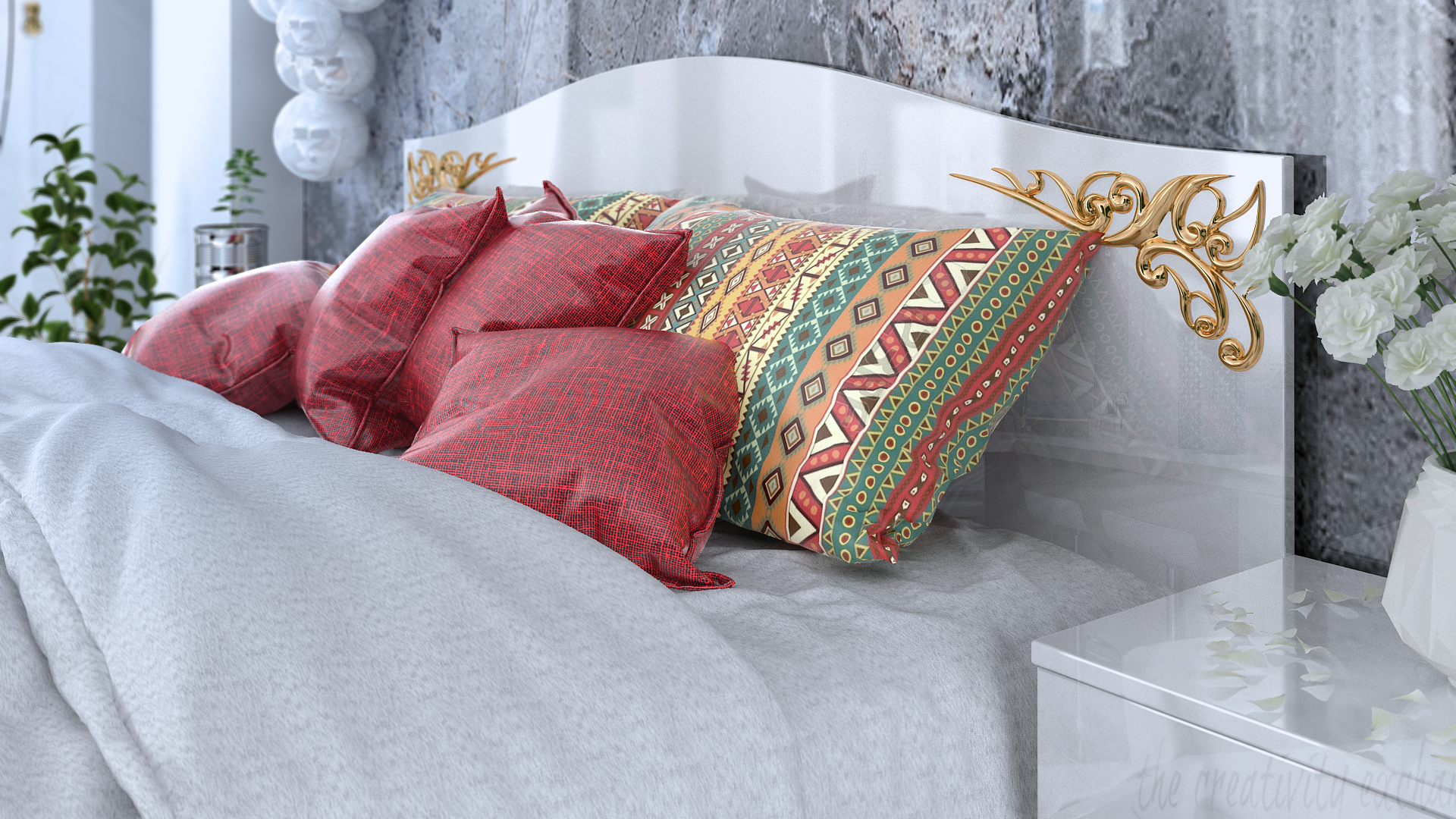 Спалнята е с изчистен и изискан дизайн в бял гланц, което придава модерно и свежо излъчване на спалнята. Подходяща е за матрак 160/200. Допълват я две нощни шкафчета с по две чекмеджета всяко, за да държиш важните неща под ръка. ПЛота е достатъчно голям, за да побере любими книги и нощна лампа. Декоративните златни орнаменти по таблата добавят усещане за лукс и стил. Удобната конструкция предлага комфорт и стабилност, а неутралният цвят лесно се съчетава с различни интериорни решения.