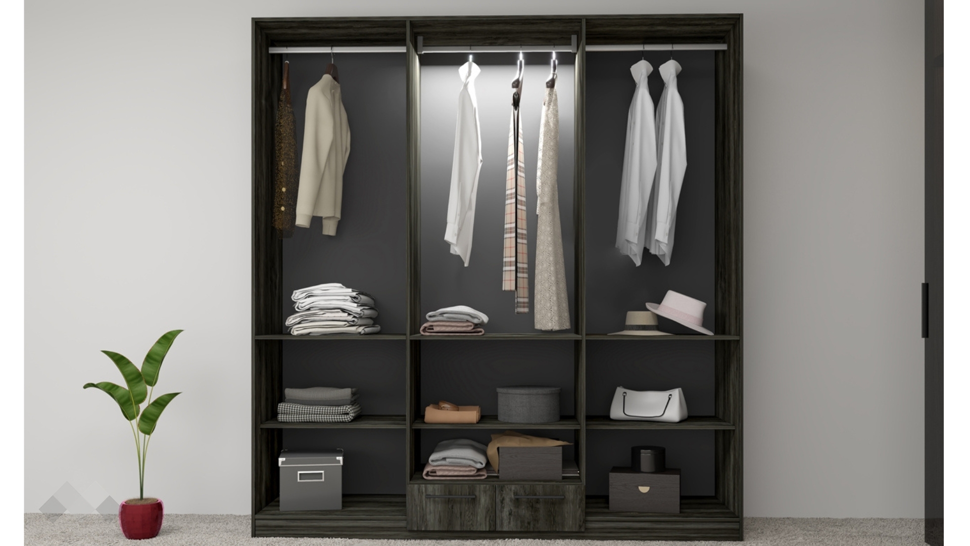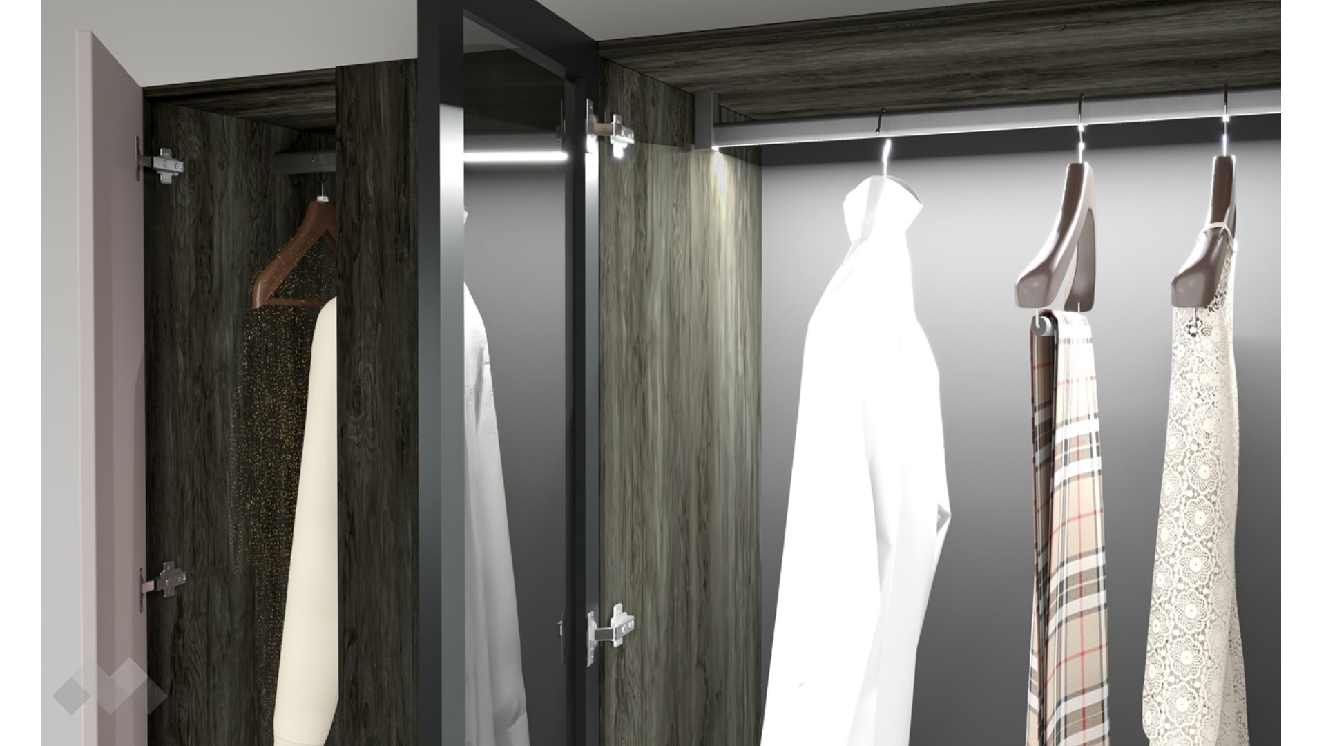 Моделът разполага с шест рафта, на които можеш да поставиш спално бельо, сгънати дрехи и кутии за съхранение на по-дребни вещи, както и с три лоста за закачалки, на които ще намериш място за елегантните си тоалети. Различното в декора на гардероб Лондон е при средните две крила, които са с алуглас врати, а лостът за закачалки отвътре е с LED осветление.