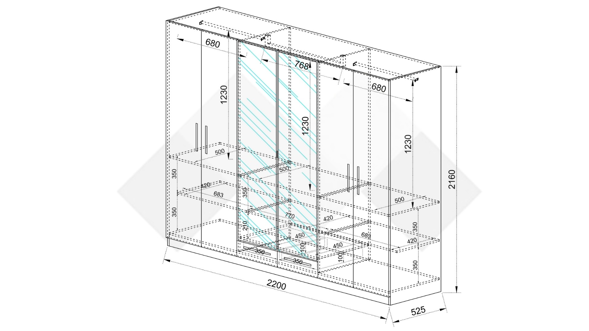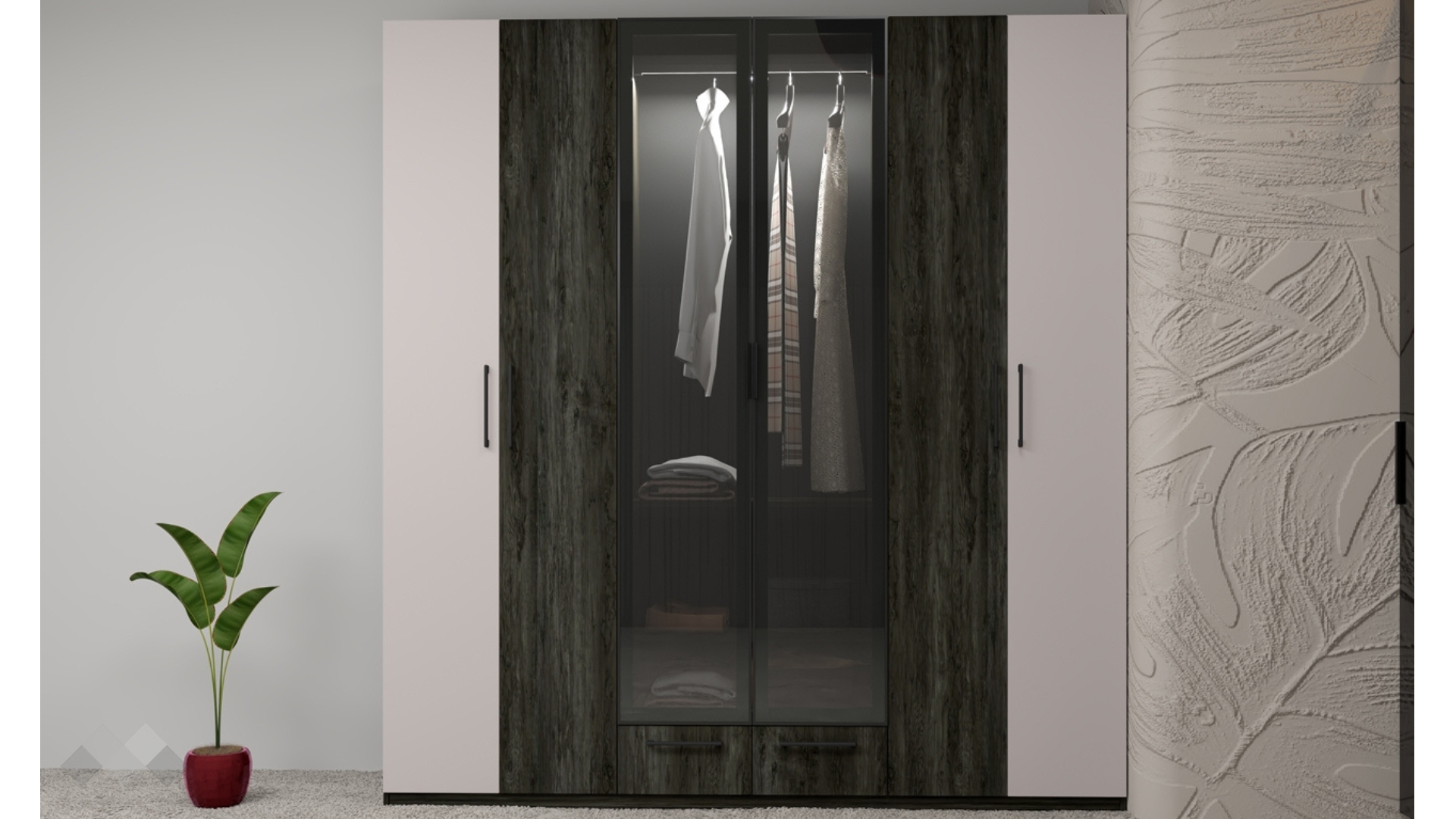 Гардеробът предлага изключително голям капацитет за съхранение, разпределен зад шест врати. Това позволява организирането на дрехи по категории, сезони или членове на семейството.