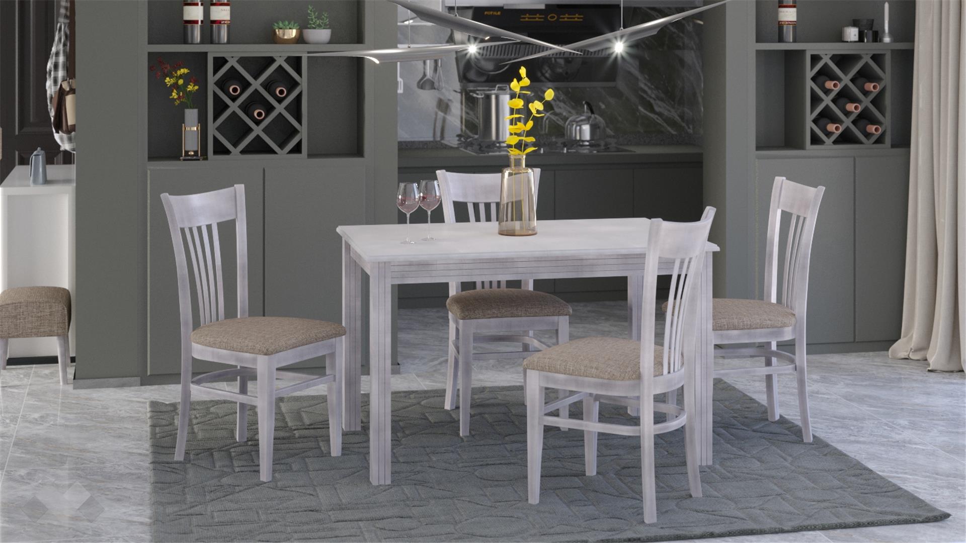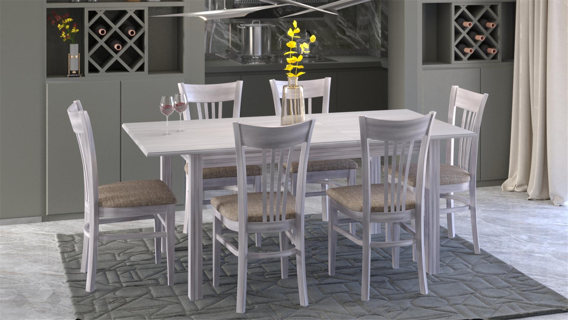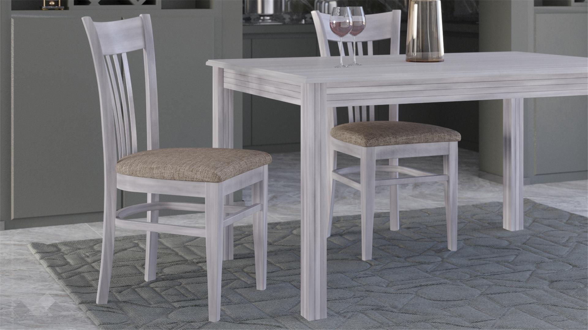 Столът е със здрава конструкция от естествена букова дървесина за устойчивост и стабилност, а лаковото покритие добавя елегантност. Седалката е проектирана с твърда основа, тапицирана с дунапрен за повече комфорт при седене и завършена със здрава текстилна дамаска, лесна за поддръжка.