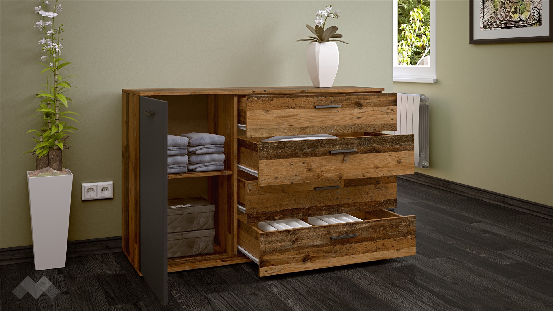 На твое разположение са четири чекмеджета, подходящи за бельо, чорапи или малки ел. уреди. Зад вратите на затворения шкаф се крият рафтове, където можеш да организираш сгънати дрехи, аксесоари или други необходими за теб неща. Горният плот е идеален за подреждане на декорации, книги, козметика, бижута или други вещи, които искаш да ти бъдат винаги под ръка.