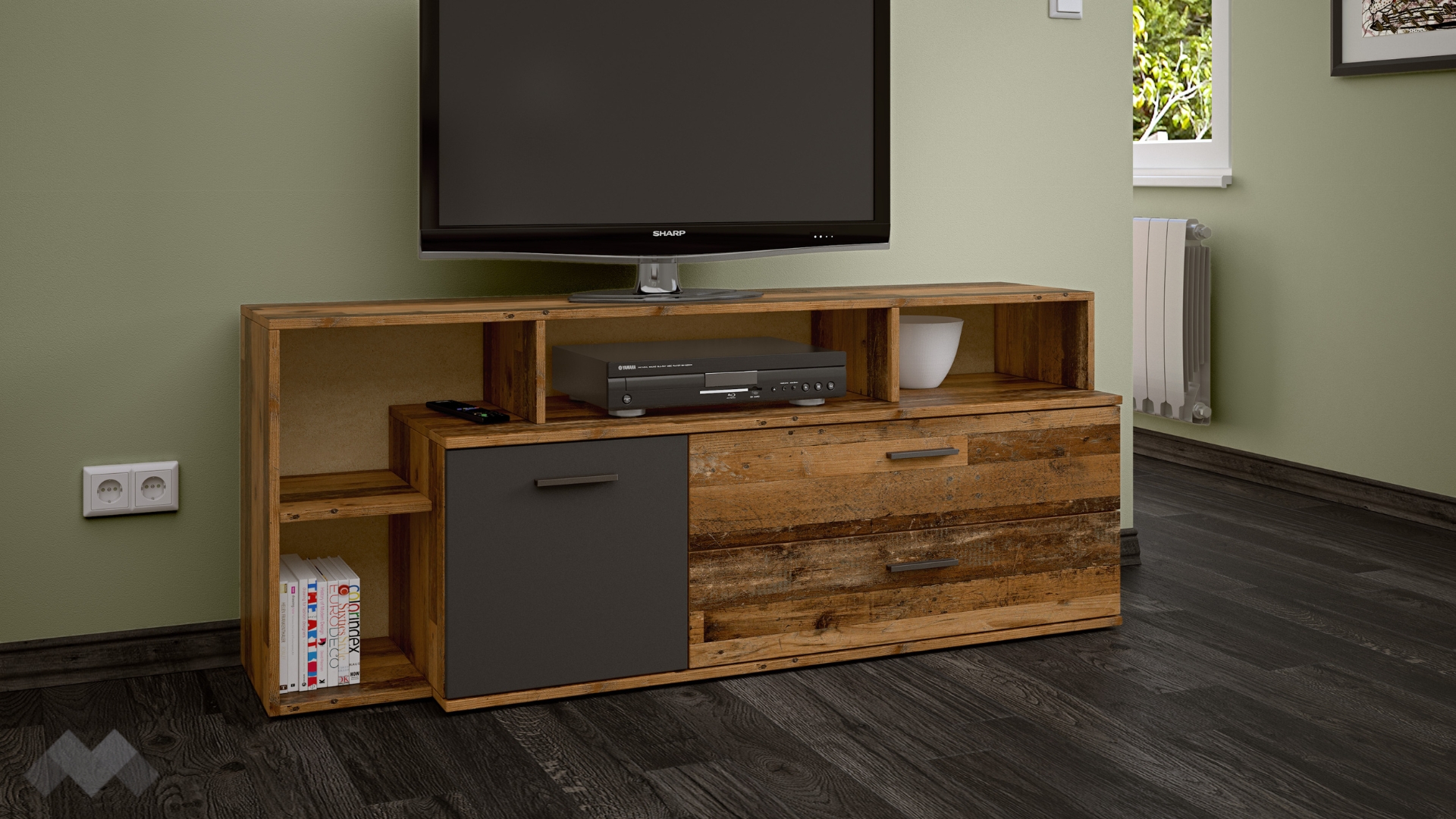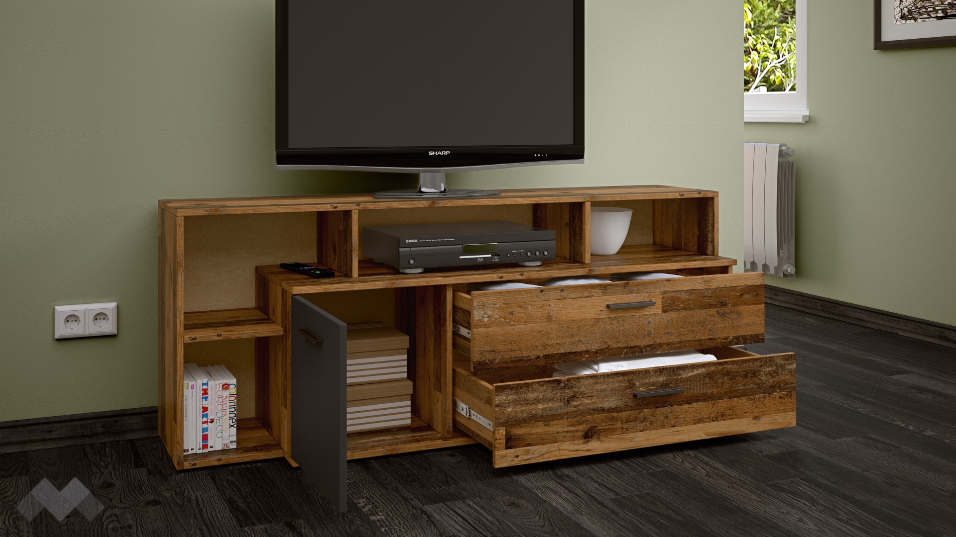 Компактните размери на ТВ шкаф Лориен позволяват да бъде поставен там, където мястото за секция е ограничено, без да се натрапва. Той разполага с достатъчно пространство за съхранение на вещи и декорации, което е отлично разпределено.
