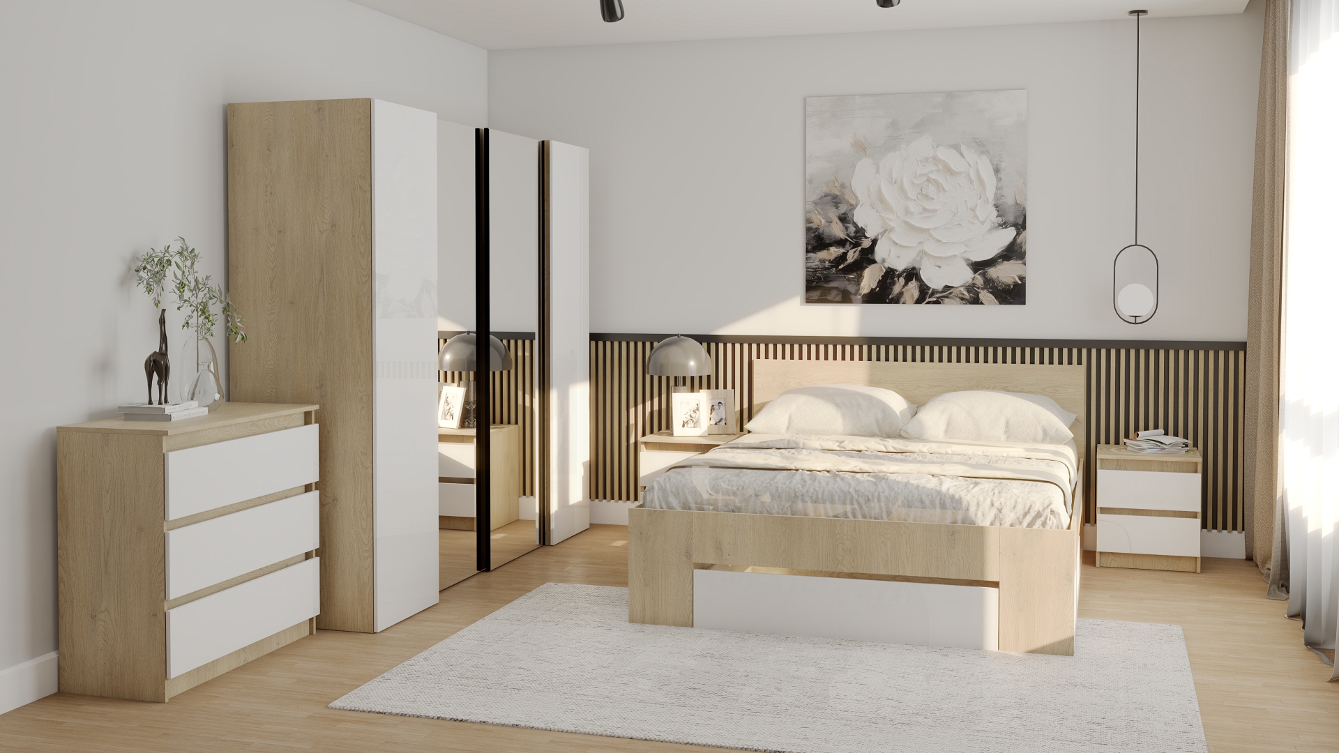 Спален комплект Лорис впечатлява със своя модерен дизайн и стабилна изработка, която гарантира дългосрочна употреба и усещане за сигурност. Той е идеално решение за всеки, който търси съчетание от комфорт, здравина и функционалност в спалното обзавеждане.