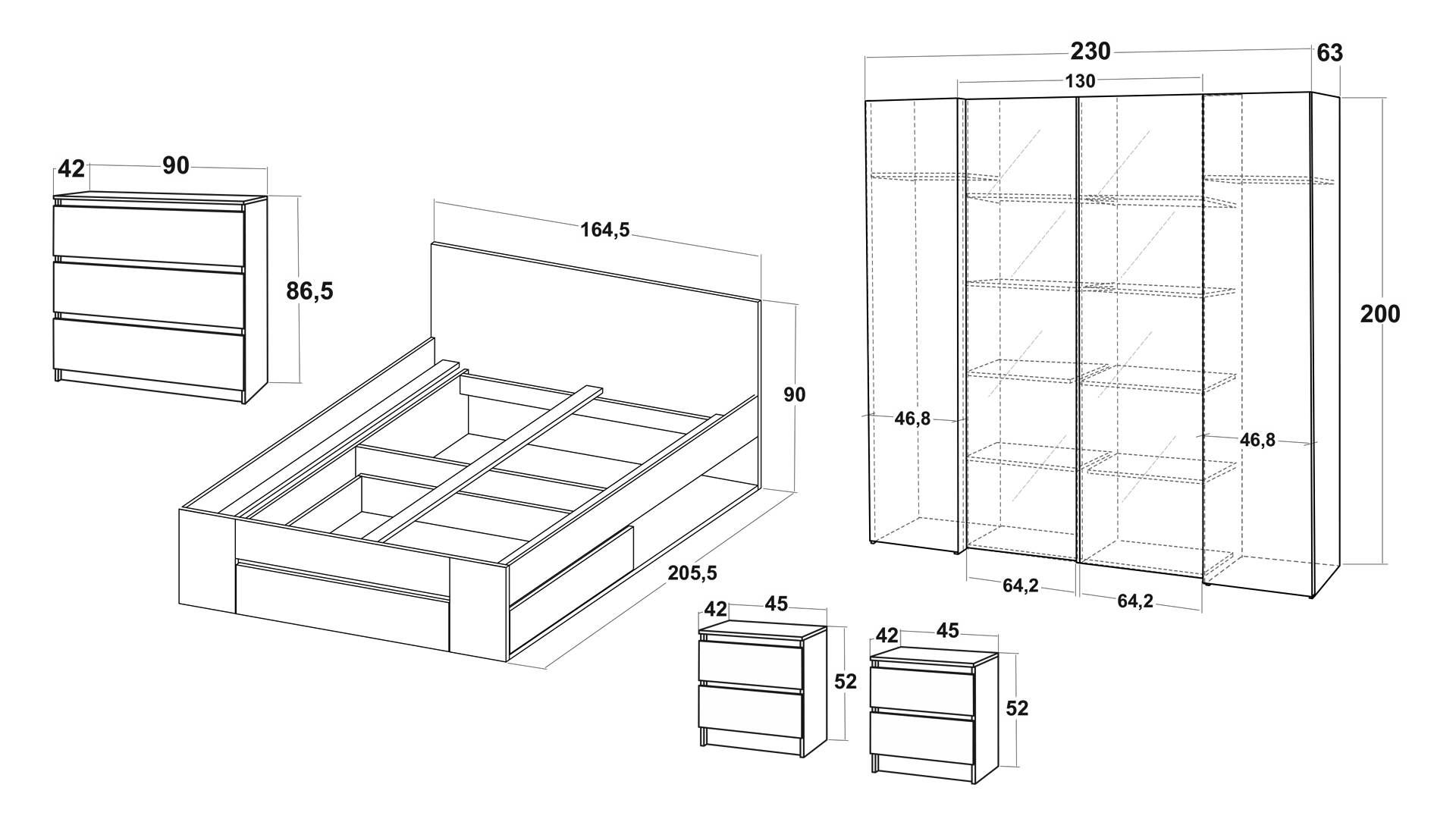 Спалня: В: 90 см Ш: 164,5 см Д: 205,5 см