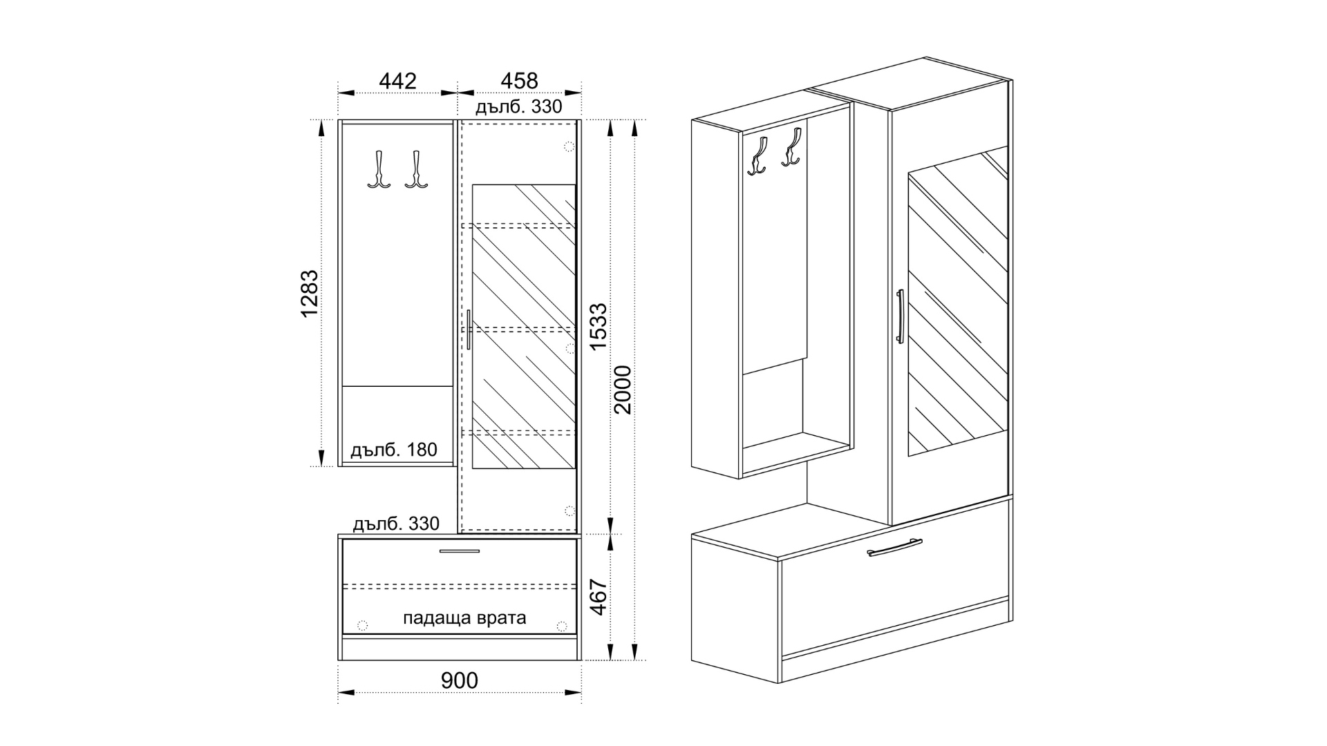 ✓ елегантен дизайн ✓ модерен декор ✓ огледало ✓ закачалки ✓ открит рафт ✓ гардероб ✓ шкаф за обувки