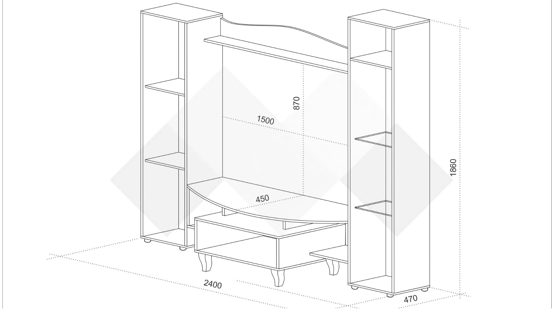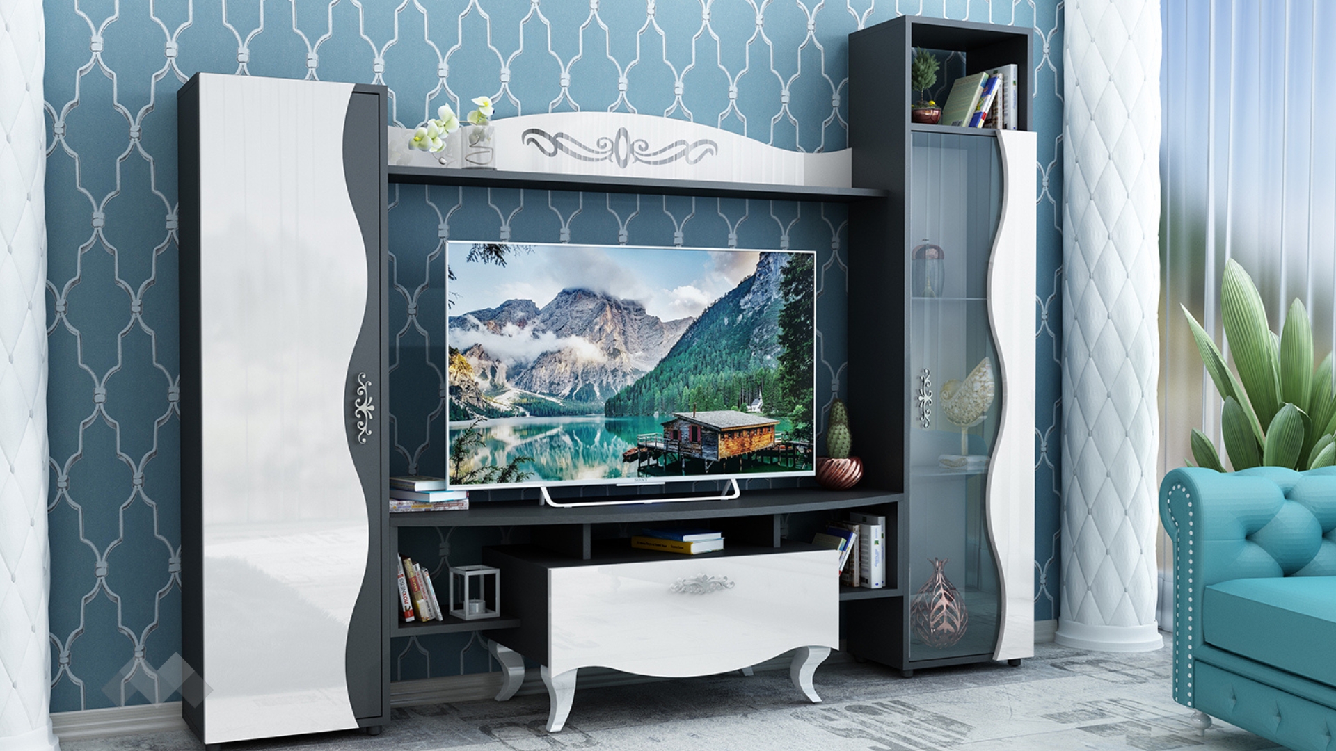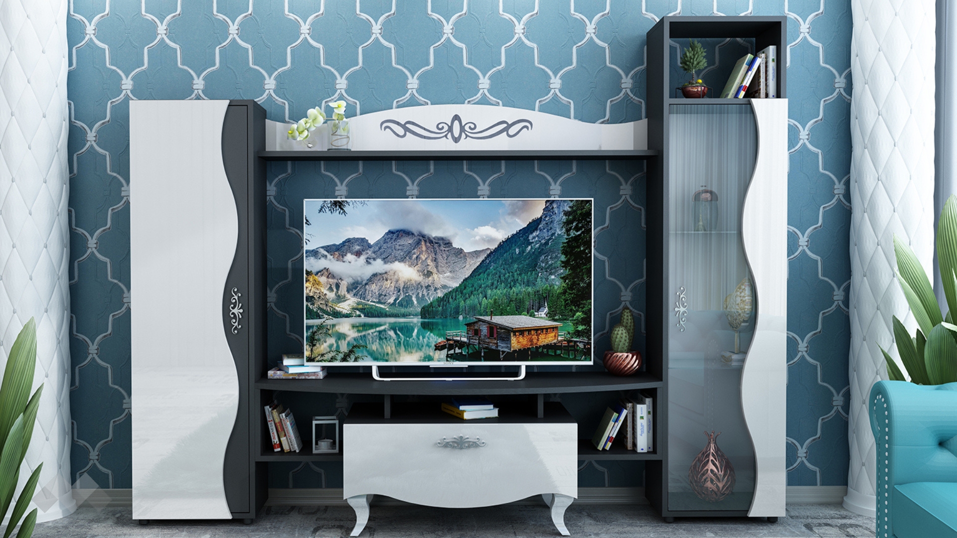 ТВ шкафа е съставен от едно затворено пространство и още три ниши около него. В тях можеш да поставиш цялата си съпътстваща техника като ТВ приемници, DVD плейъри или друга техника. Още един широк рафт се разполага над мястото за телевизора – там можеш да аранжираш с скъпи спомени като фотографии или сувенири, а може и да аранжираш със стилни декорации и украси – изборът е твой!