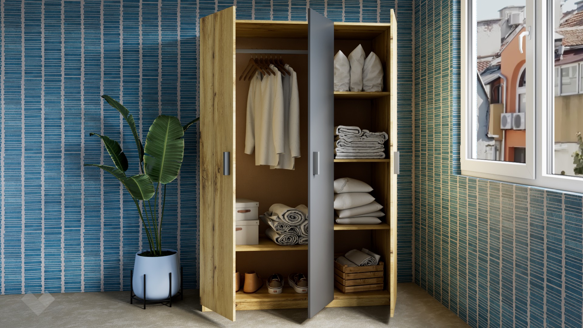 От дясната страна ще откриеш три рафта, където да подредиш дрехите, които съхраняваш сгънати – тениски, пуловери, дънки и други. От лявата страна на гардероба са разположени широк рафт и лост за закачалки. Можеш да използваш рафта за организиране на хавлии, спално бельо, възглавници и завивки. Лостът за закачалки е подходящо място за елегантното облекло, което се мачка лесно.