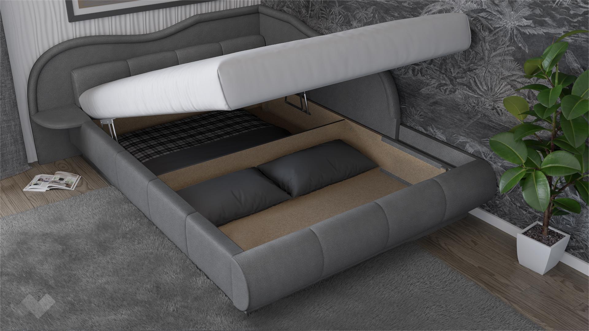 Леглото е с меки форми и елегантен дизайн. Подходящо е за матрак 140/200 см. Под матрака се открива широко пространство, готово да побере всички възглавници и завивки, на които все не намираш място. Така не се налага да закупуваш допълнителни шкафове у дома и пестиш пространство и пари.
