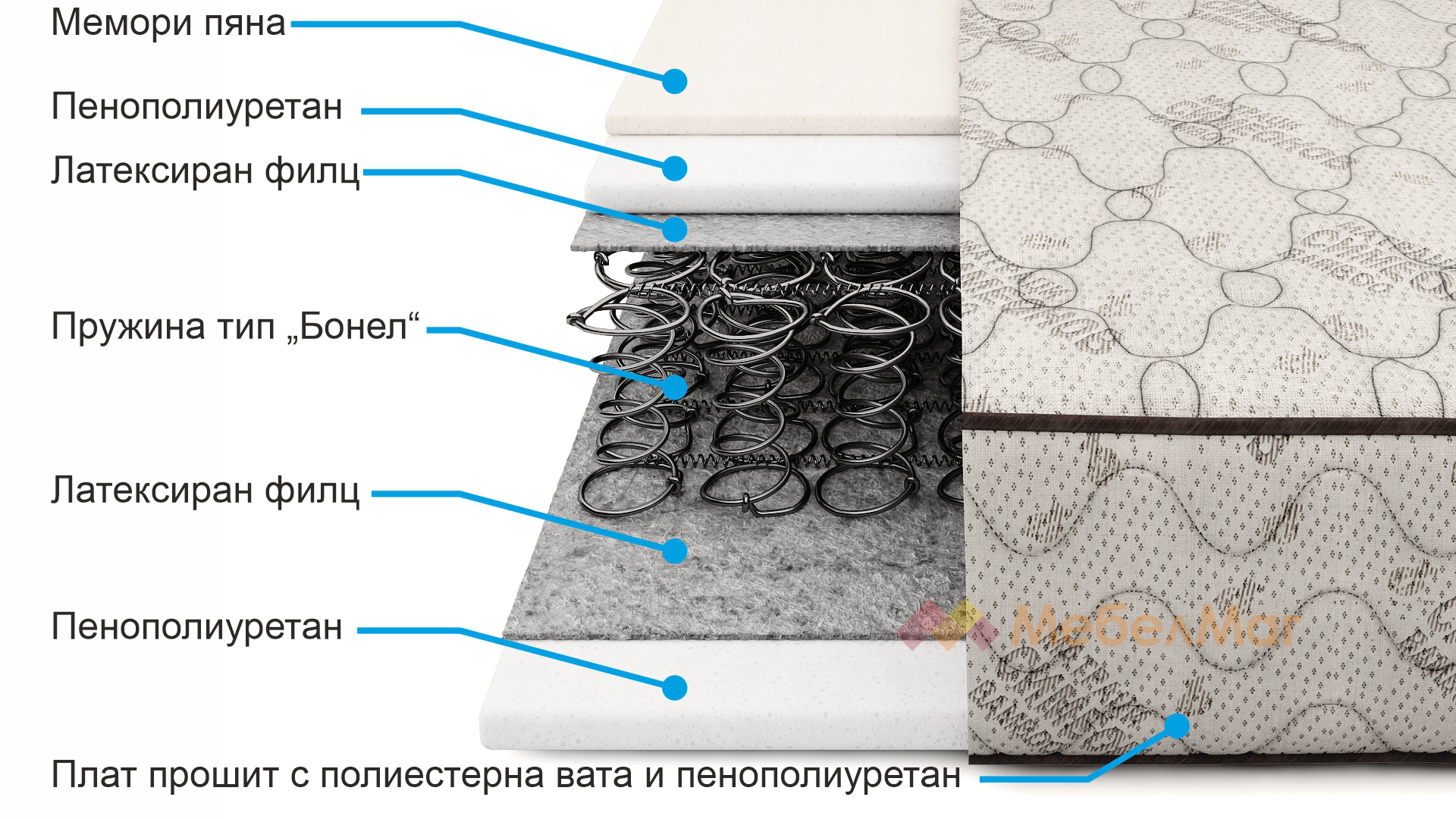 Слоят от мемори пяна оказва стабилна поддръжка, без да създава точки на напрежение. Мемори пяната е материал с добра плътност, но едновременно и с добра еластичност.