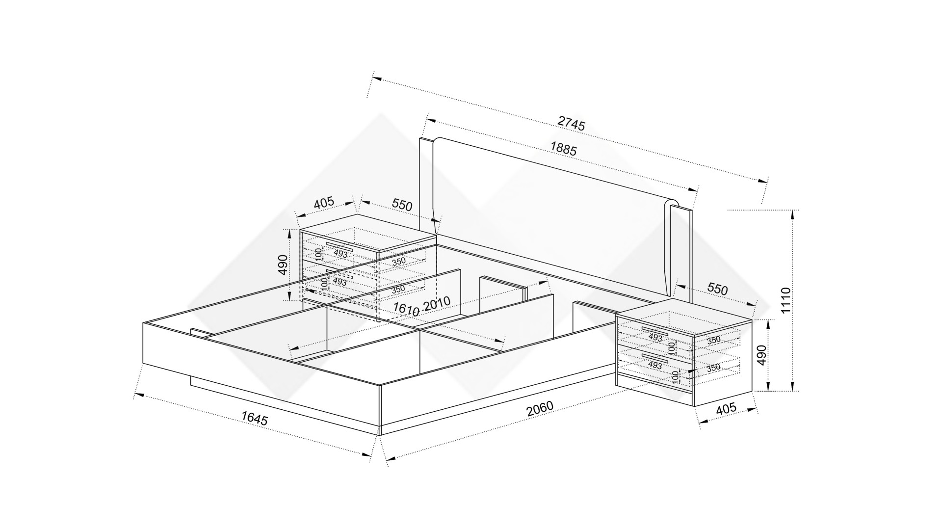 Към спалнята са включени две нощни шкафчета с по две чекмеджета, където да съхраняваш най-необходимите ти вещи и винаги да са под ръка. Чекмеджетата са с механизъм за плавно затваряне. Отгоре можеш да поставиш телефона, любимата книга или недочетеното списание.