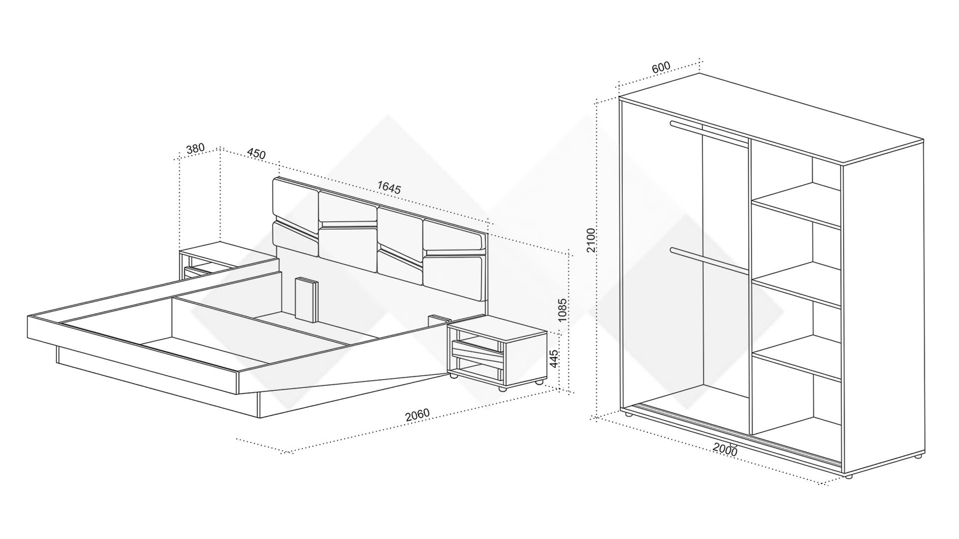 Този модерен спален комплект е създаден за почитателите на естетиката, които търсят смела, но хармонична визия в интериора. Отличава се с ярко изразена идентичност, съчетаваща геометричен дизайн, цветови контрасти функционални решения, вписани в съвременна среда.