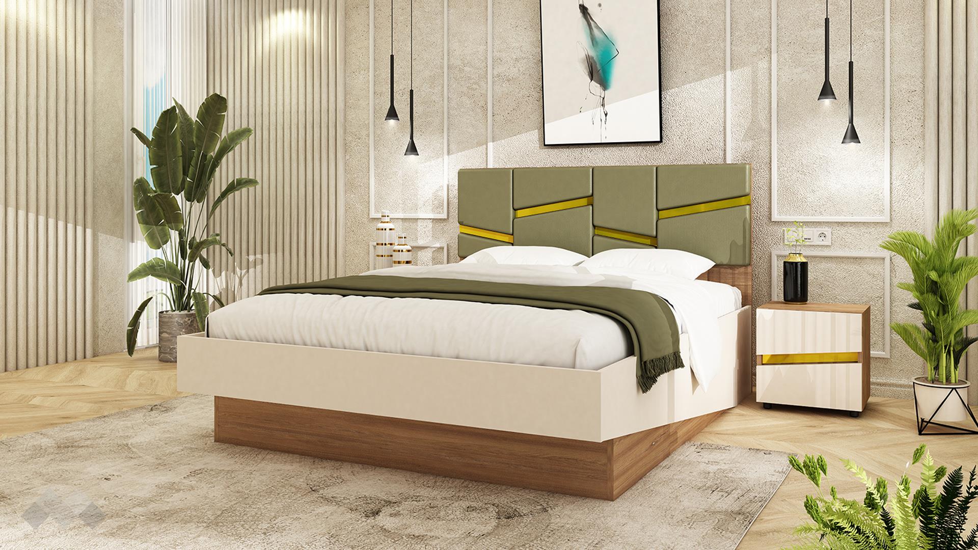 Централно място заема спалнята с висока тапицирана табла за матрак 160/200, съставена от модулни панели в маслиненозелено със златни декоративни ленти, които се повтарят и върху гардероба и скрина. Таблата е не само стилна, но и изключително комфортна за облягане.