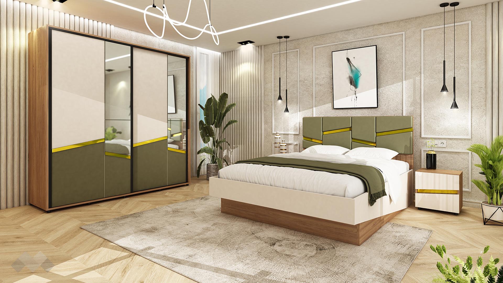 Изработен от висококачествено 16 мм ПДЧ, спалният комплект съчетава стил и устойчивост. Цветовата комбинация между светлия кашмир, маслиненозелено с денвър и енергичен златен акцент превръща тази спалня в модерно и вдъхновяващо пространство за почивка.