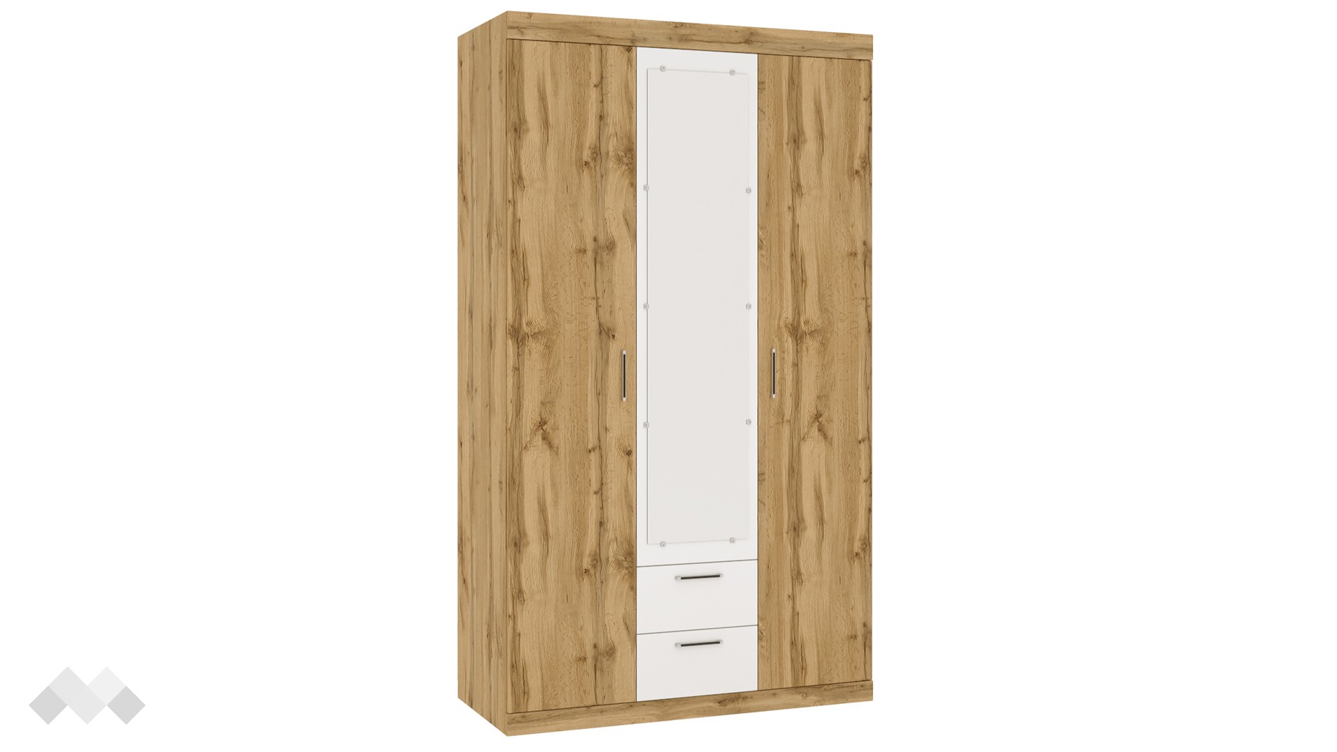 Той е трикрилен, със 7 обемни рафта, лост за закачалки и две чекмеджета. Има практично разпределение, което ти позволява да подредиш добре всички дрехи и аксесоари. Можеш да използваш рафтовете за съхранение на сгънати дрехи, по-обемни пуловери, завивки или други вещи, на лоста да закачиш всичко, което искаш да бъде готово за обличане, а в чекмеджетата да организираш бельо или аксесоари. Огледалото към този стилен гардероб ще е твой верен помощник, за да огледаш добре своята завършена визия за деня.