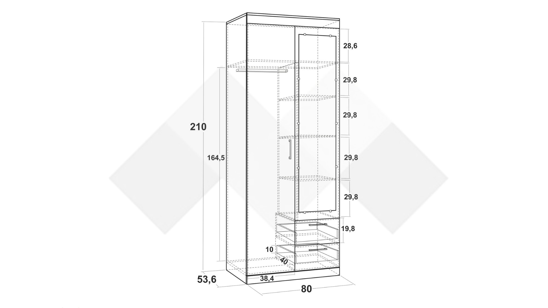 Благодарение на практичното разпределение на вътрешното пространство, с лекота ще можеш да организираш и съхраняваш дрехите си, като същевременно ще имаш бърз достъп до всеки тоалет. В двете чекмеджета е удобно да съхраняваш бельо, чорапи или други аксесоари. Комбинацията от рафтове и лост за закачалки ти дава възможност да организираш дрехите си по най-удобния за теб начин.