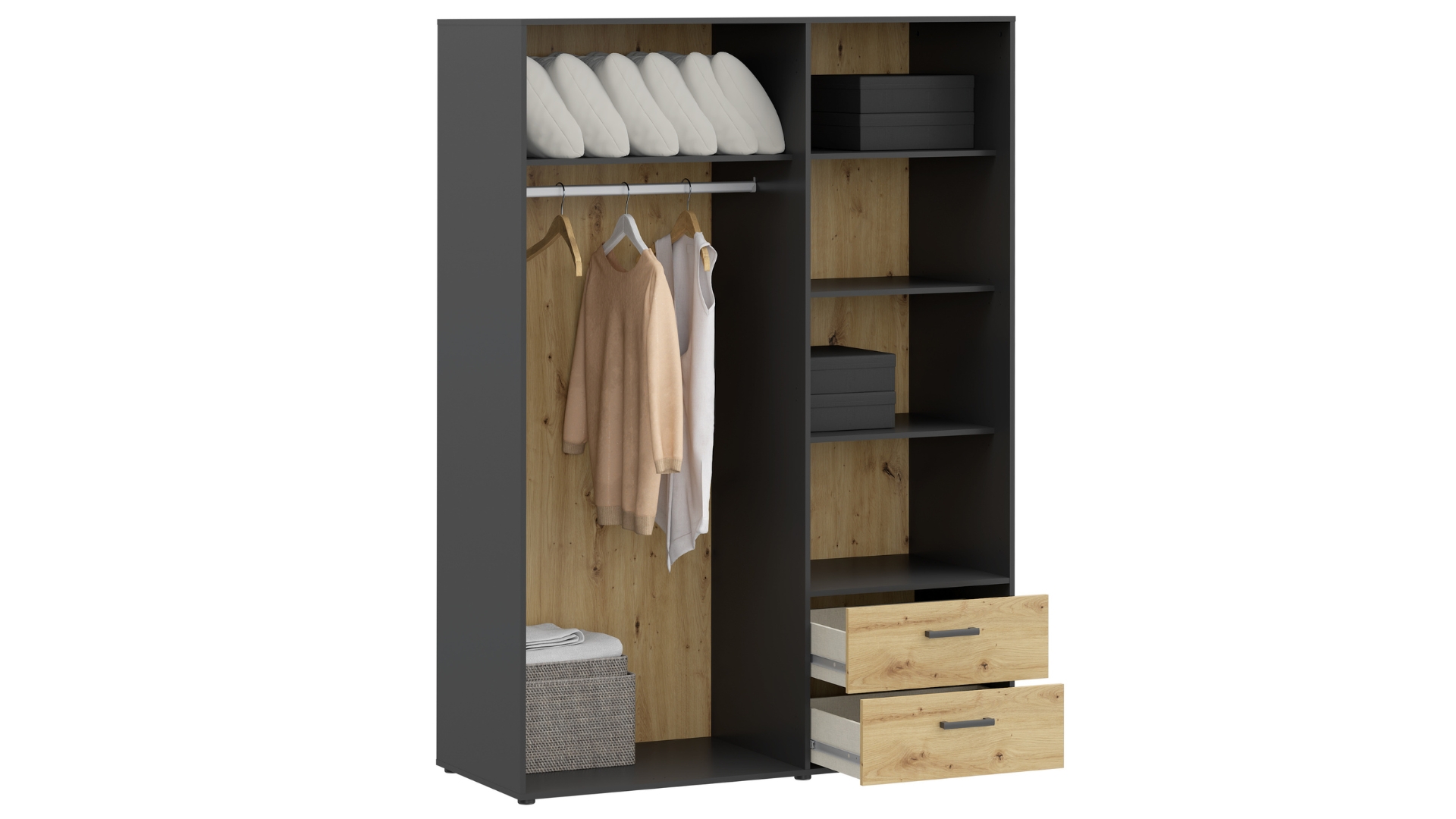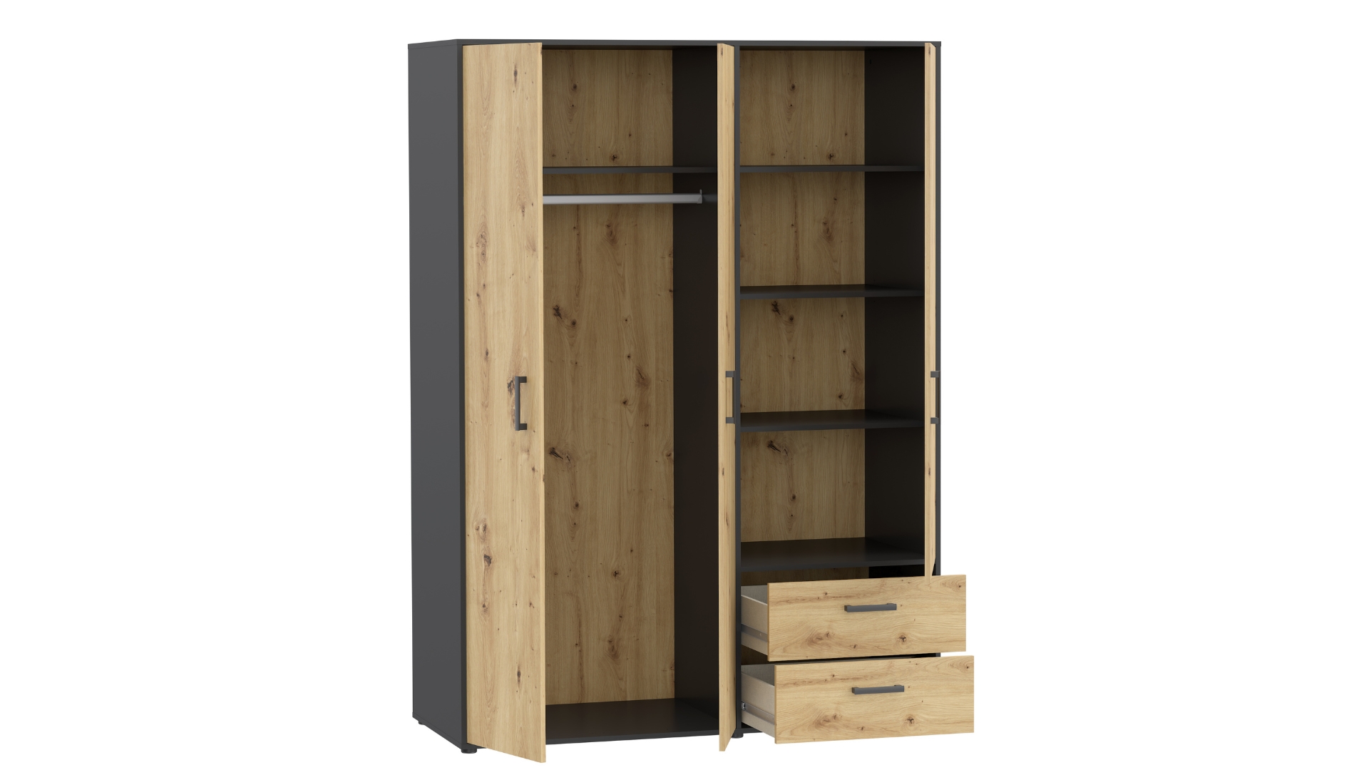 ✓ трикрилен ✓ оптимално разпределение ✓ 4 рафта ✓ лост за закачалки ✓ 2 чекмеджета с телескопични водачи ✓ качествена изработка ✓ модерен дизайн ✓ 15 мм ПДЧ