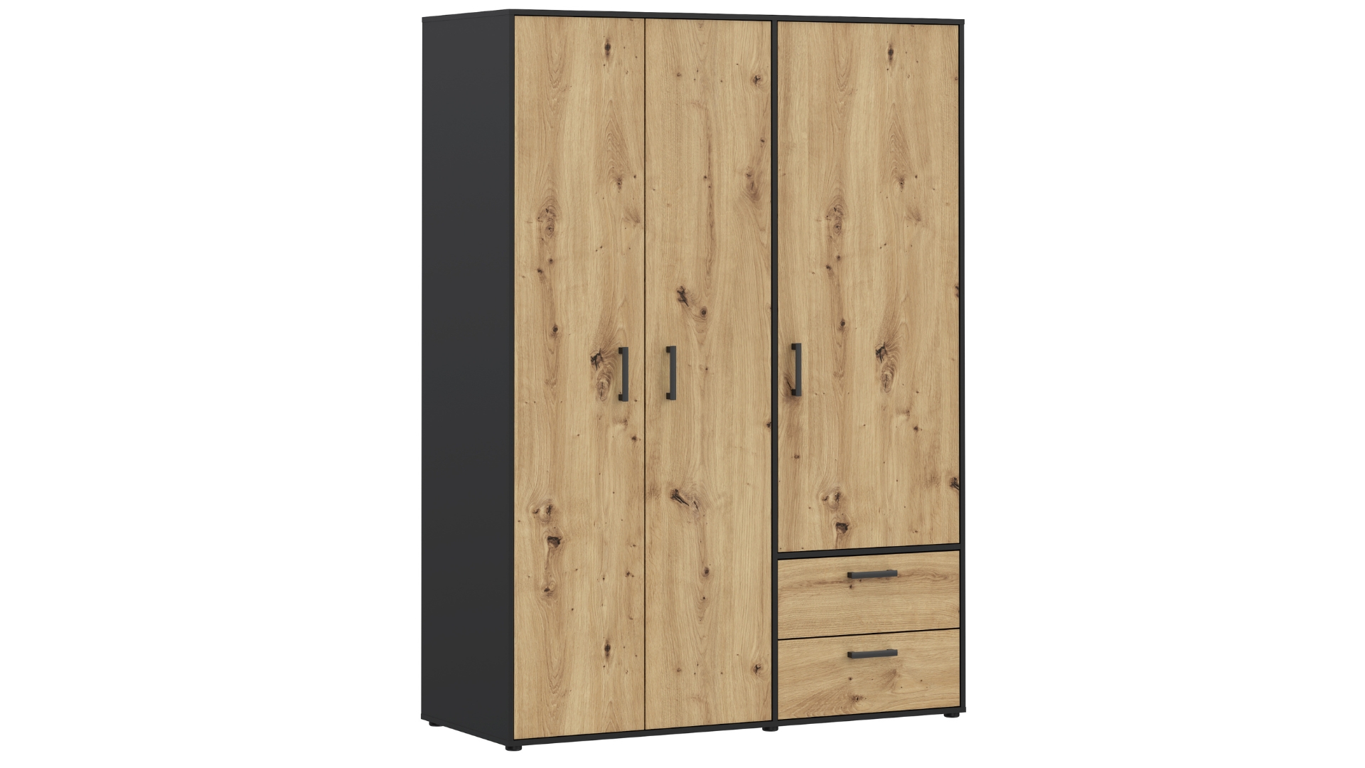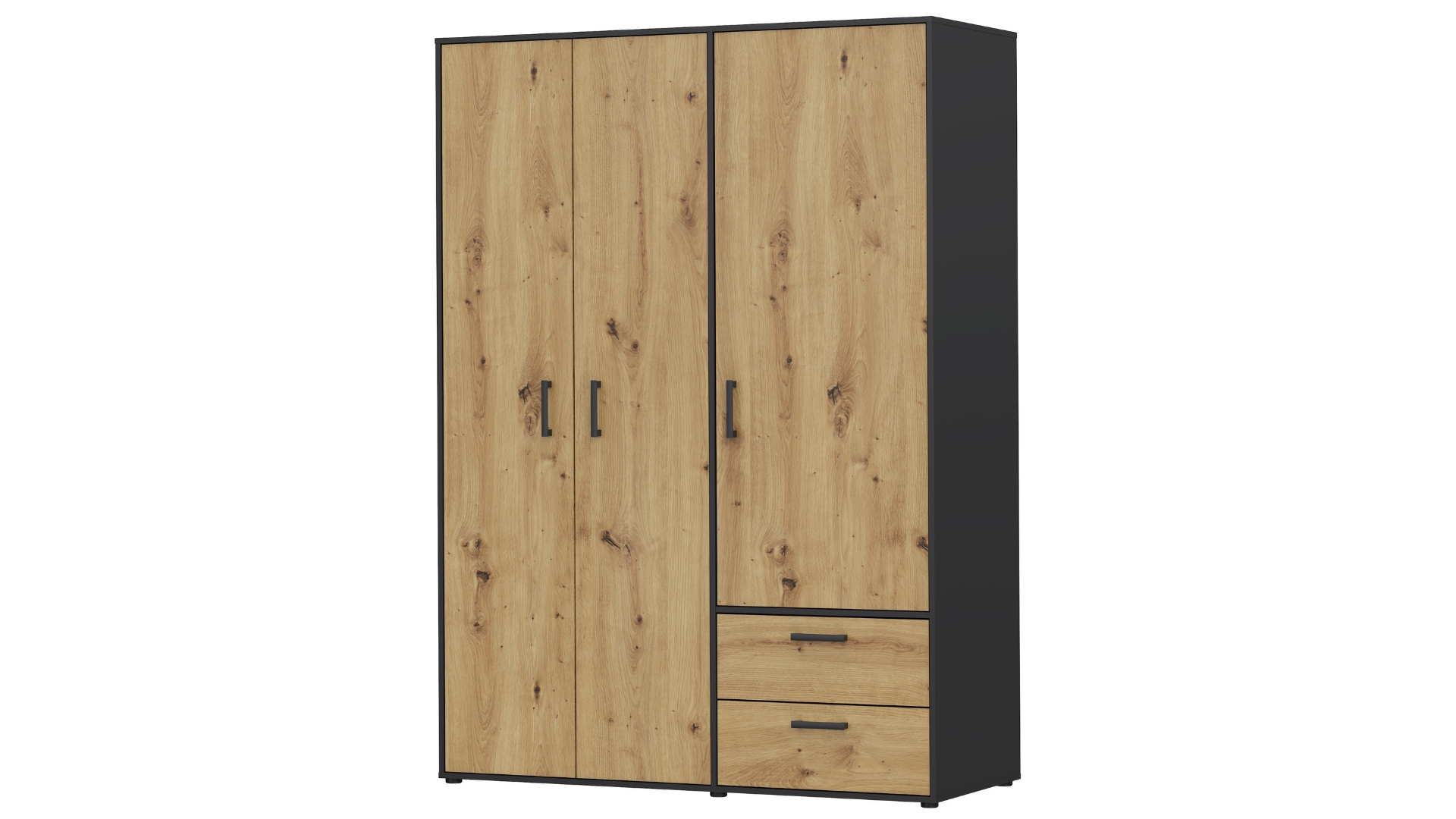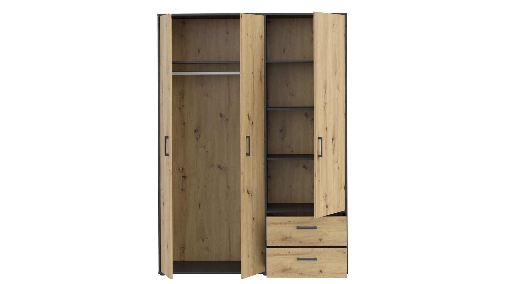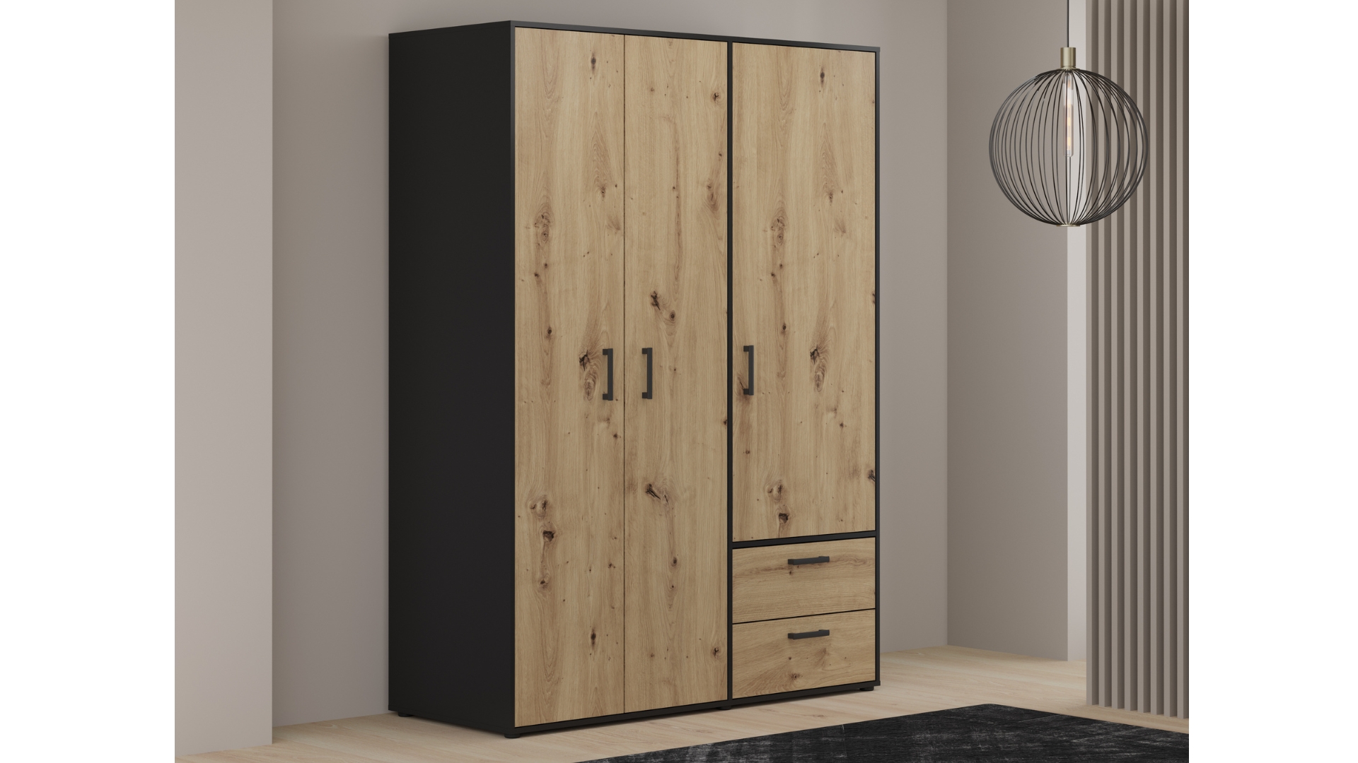 ⭐ Предимства: ✓ трикрилен ✓ оптимално разпределение ✓ 4 рафта ✓ лост за закачалки ✓ 2 чекмеджета с телескопични водачи ✓ качествена изработка ✓ модерен дизайн ✓ 15 мм ПДЧ