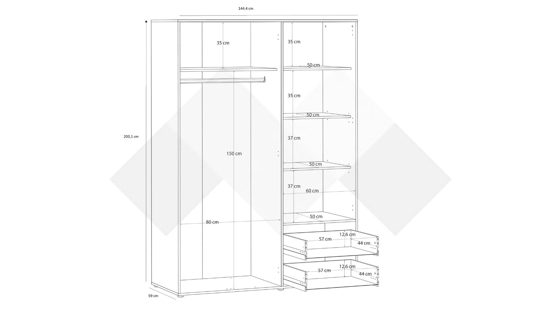 Този трикрилен гардероб впечатлява със своето оптимално разпределение на вътрешното пространство. Той разполага с 4 рафта, които осигуряват достатъчно място за подреждане на сгънати дрехи, спално бельо, кутии и други вещи. В допълнение, гардеробът включва лост за закачалки, идеален за съхранение на по-дълги дрехи като рокли, палта или костюми, предпазвайки ги от намачкване.
