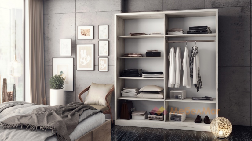 Гардеробът отговаря на всички съвременни стандарти за съхранение на дрехи, разполага с 6 широки рафта и лост за закачалки. Вратите му са плъзгащи, което прави комплекта подходящ и за по-малки помещения, тъй като не е необходимо допълнително пространство за отваряне на вратите. Една от вратите разполага с огледало, разположено по цялата ѝ дължина и височина.
