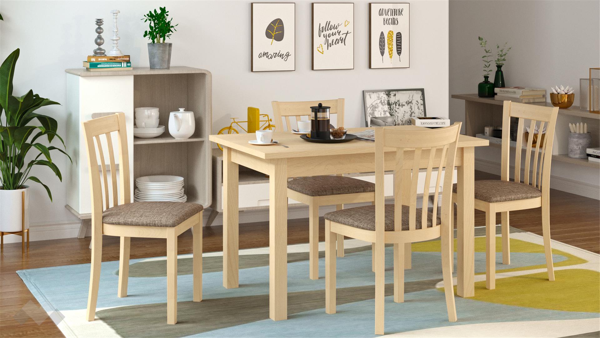 Трапезен комплект Нати М разполага с маса с дължина 110 см и 4 стола. Комплектът е изработен от масивна дървесина. А когато се нуждаеш от повече място, масата се разтяга до 138 см. Столовете са също толкова здрави и стабилни. Седалната част е достатъчно мека, за да ти е комфортно и в същото време удобно за хранене.