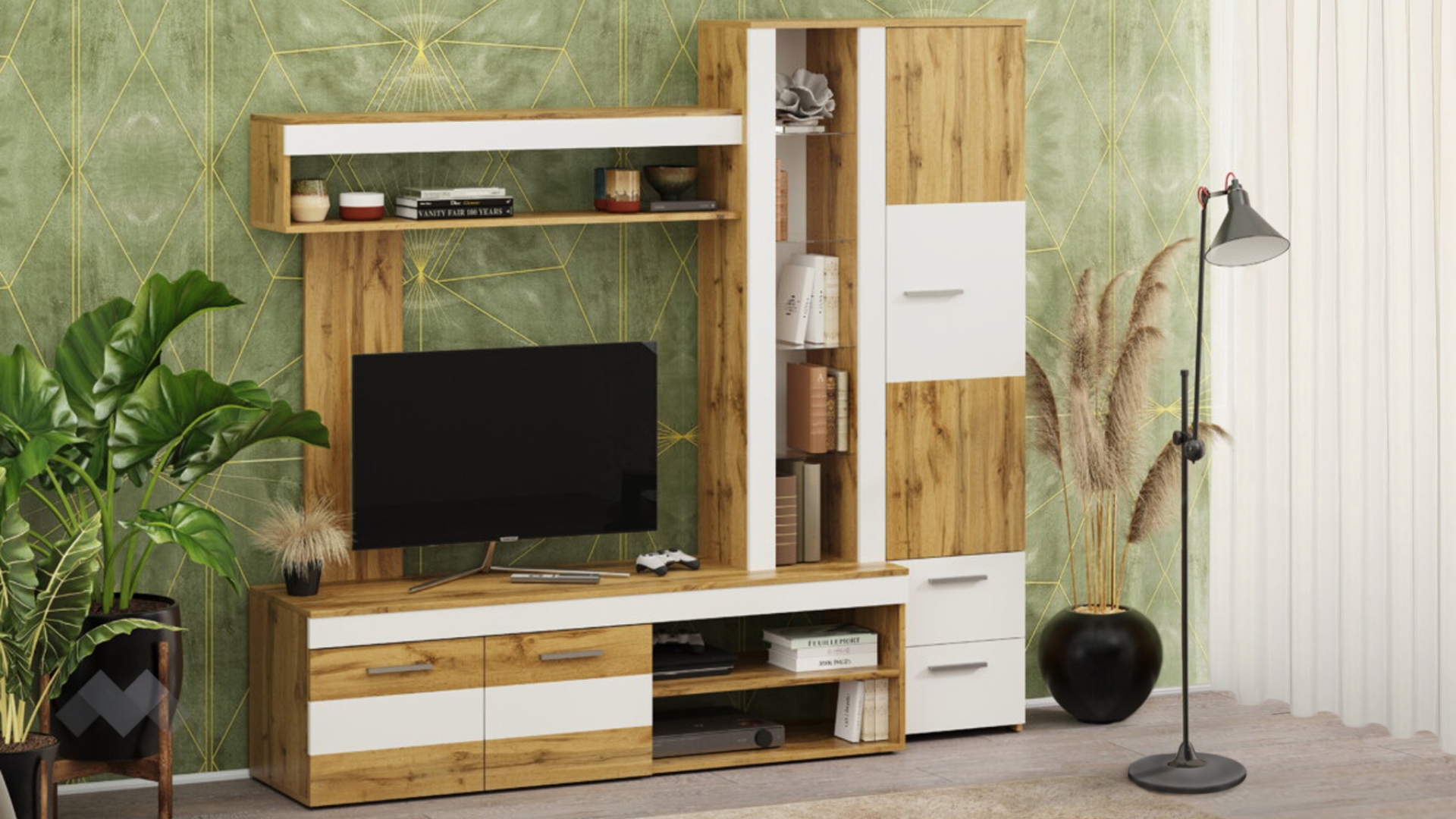 ⭐ Предимства: ✓ място за телевизор✓ етажерка ✓ отворени рафтове ✓ 3 шкафа ✓ две чекмеджета ✓ стилен и практичен дизайн ✓ качествена изработка ✓ 16 мм ПДЧ