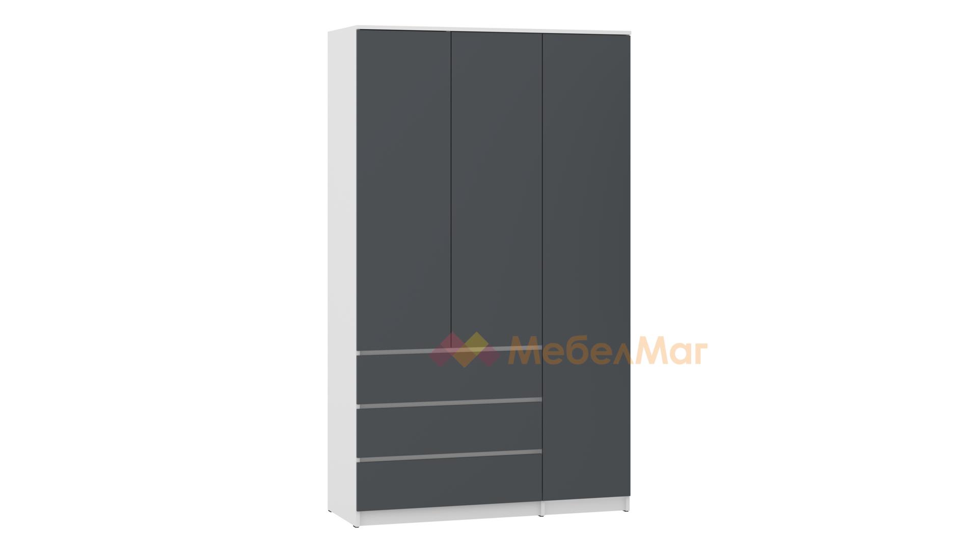 Трикрилният гардероб съчетава елегантен дизайн и функционалност. Той осигурява достатъчно място за дрехи и аксесоари. Идеален за всяка спалня, този гардероб добавя нотка изисканост и ред. Той ще те впечатли с функционално разпределение, което ще ти позволи да подредиш добре всички дрехи и аксесоари. Зад крилата ще намериш широко пространство, седем рафта и лост за закачалки, където да съхраниш ризи, сака или по-обемни дрехи като палта. В долната си част гардеробът изненадва с нестандартно решение от три големи чекмеджета, където можеш да организираш бельо, чорапи, малки електроуреди или друг вид вещи, нуждаещи се от място. Изненадата в гардероба е огледалото, което се намира зад вратичката, с помощта на което лесно ще можеш да подбереш тоалета си. Още едно предимство, с което разполага гардероба, са телескопичните водачи на чекмеджетата - те са по-здрави и издържливи във времето.