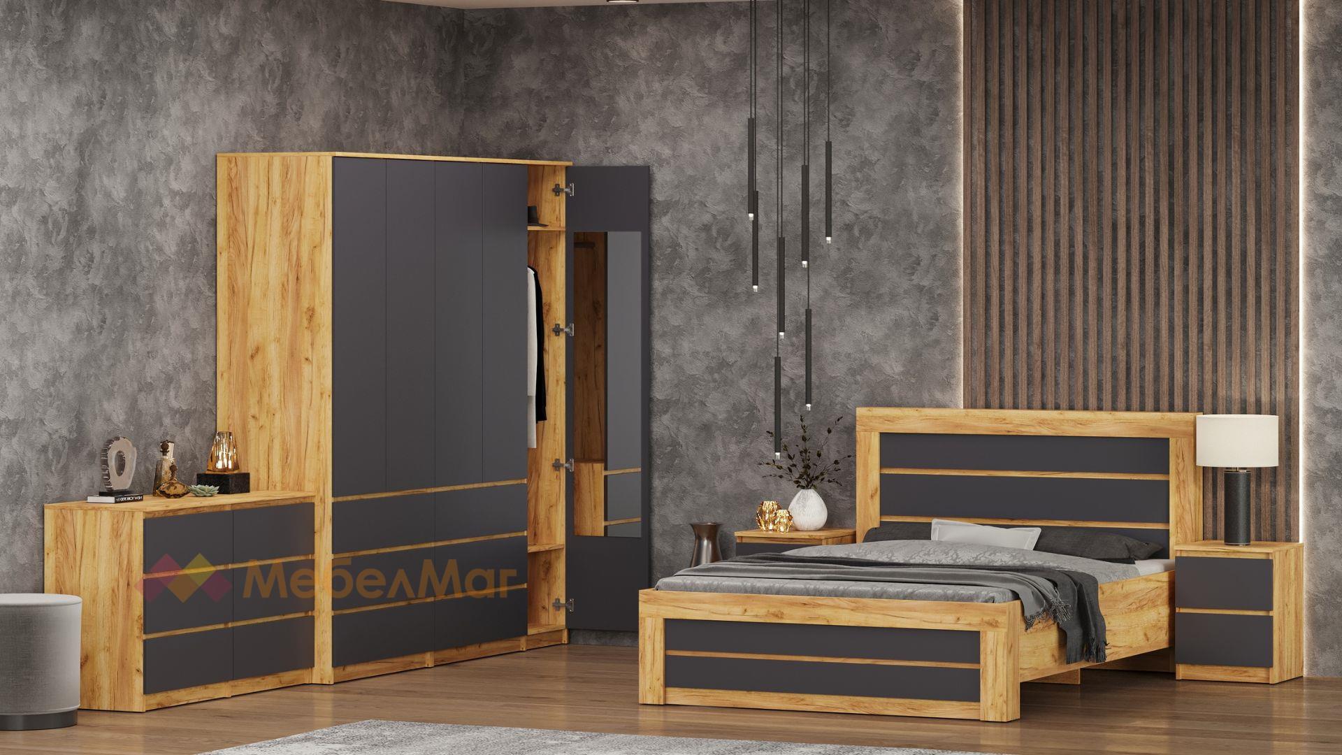 ✓ спалня с акцентна табла ✓ трикрилен гардероб ✓ двукрилен гардероб ✓ скрин с 6 чекмеджета ✓ 2 броя нощни шкафчета ✓ елегантен дизайн ✓ качествена изработка ✓ 16 мм ПДЧ