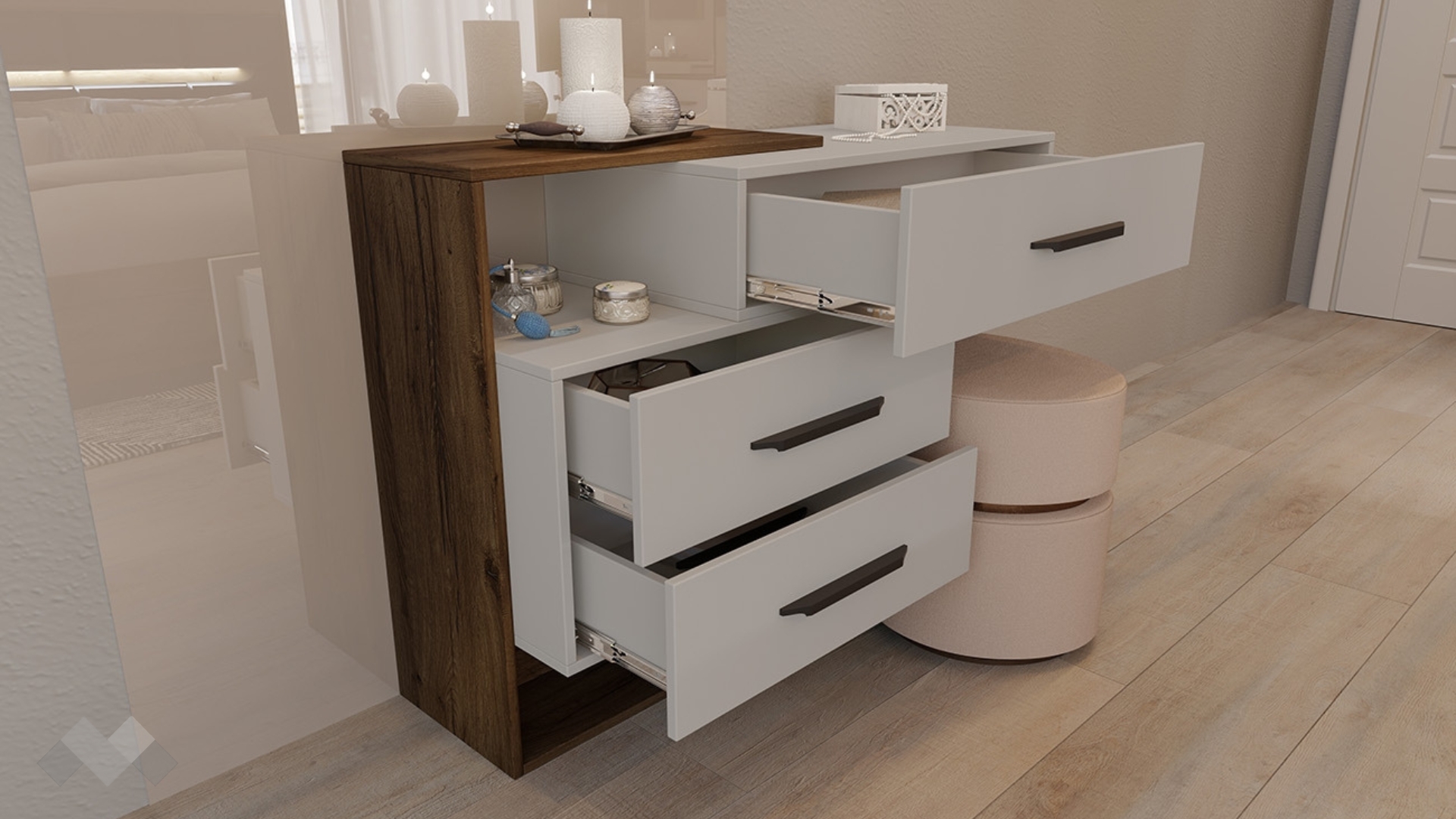 С тоалетка Норел ще имаш достатъчно място за всичко, с което поддържаш външния си вид перфектен. Ще можеш да съхраниш своите аксесоари, гримове и всички принадлежности, благодарение на трите чекмеджета с пълно изтегляне и плавно затваряне. На отворените рафтове можеш да поставиш красива декорация, бижута или всичко, което би направило спалнята ти още по-приветлива. Освен това разполагаш и с огледало, което е незаменим помощник в поддръжката на външния ти вид и сигурен начин да се чувстваш комфортно.
