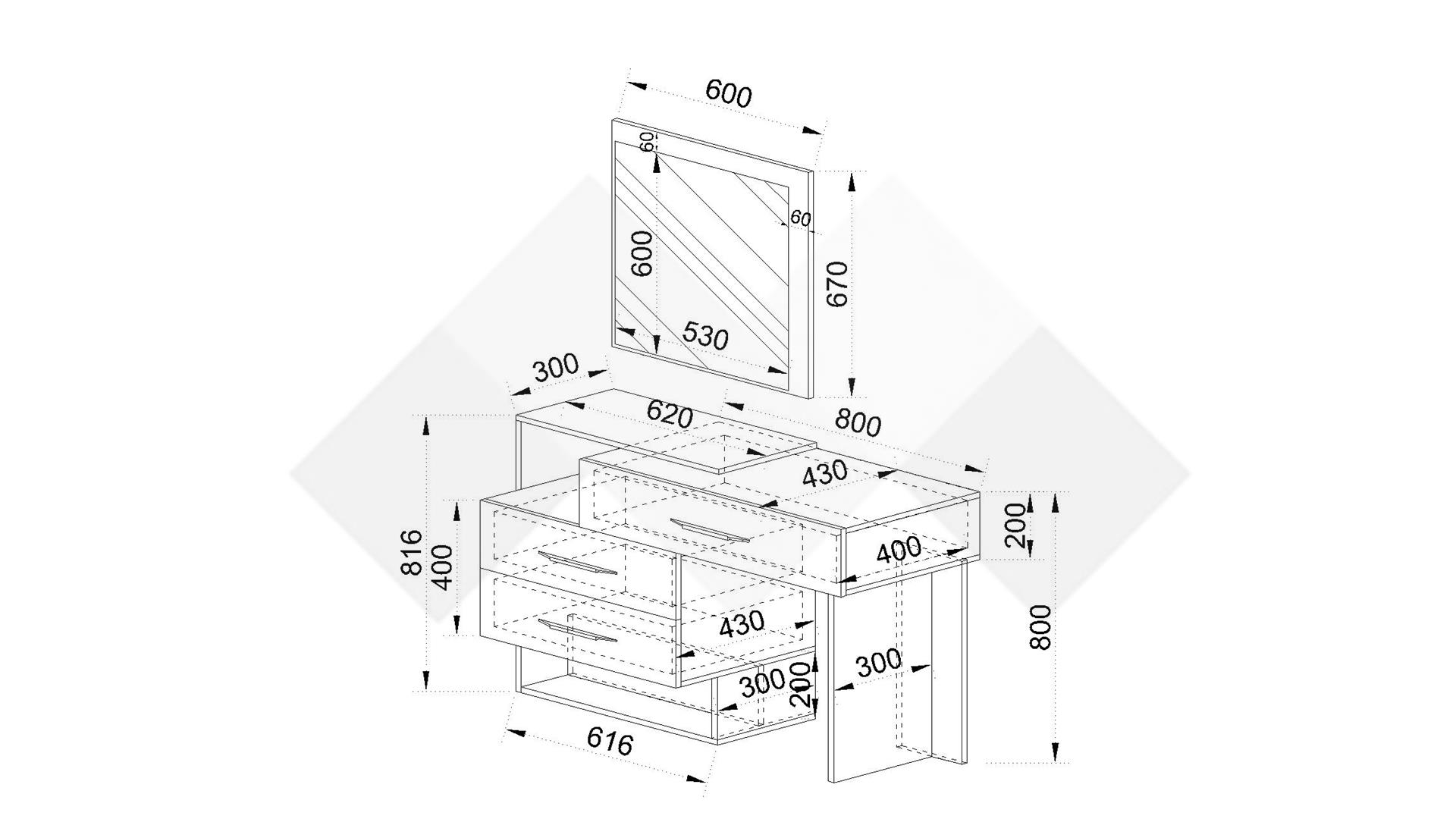 Тоалетка: Д: 112 см. Ш: 43 см. В: 81,6 см.