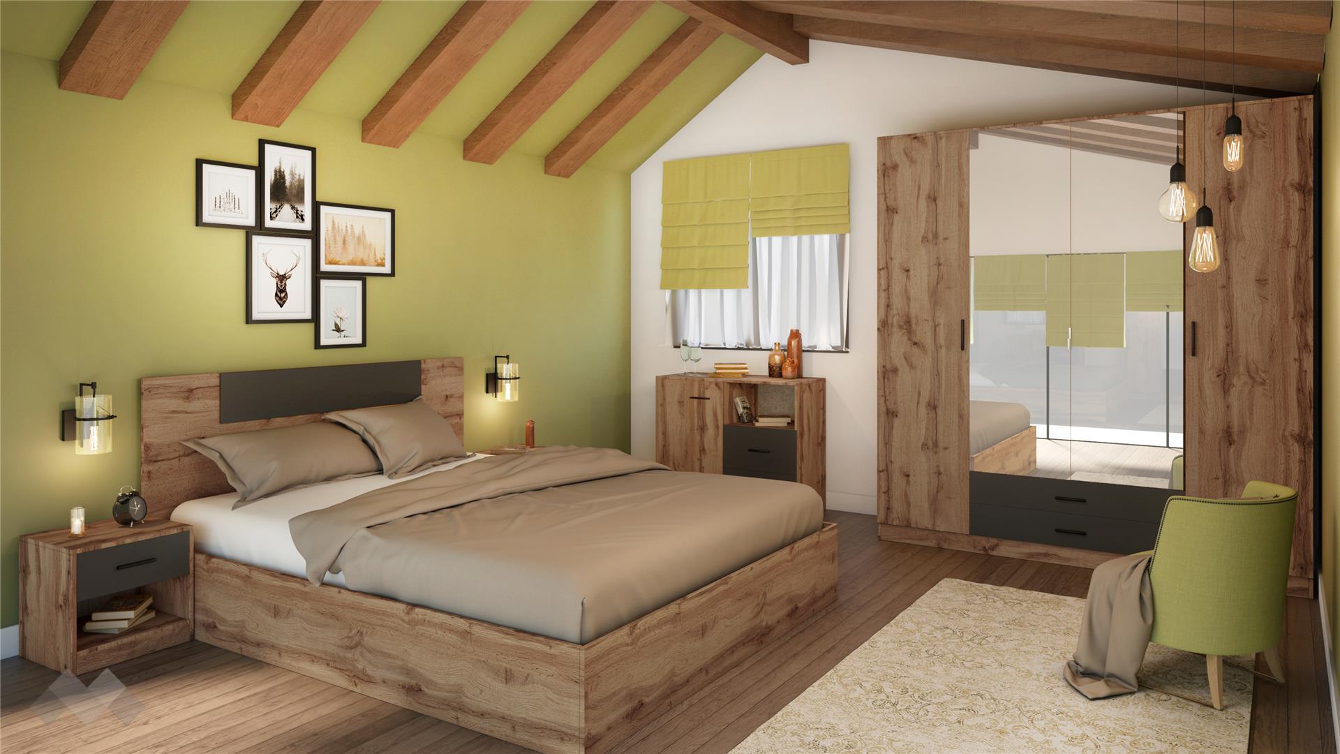 Спалнята е достатъчно голяма, за да ти предостави нужното пространство и комфорт на спане. Таблата е ефектно декорирана с акцент в цвят графит. Двете нощни шкафчета са перфектното място за кокетна нощна лампа, любимата книга, фотография или където да поставиш мобилния, за да е винаги под ръка, когато ти потрябва. Разполагаш с едно чекмедже и още един отворен рафт под него.