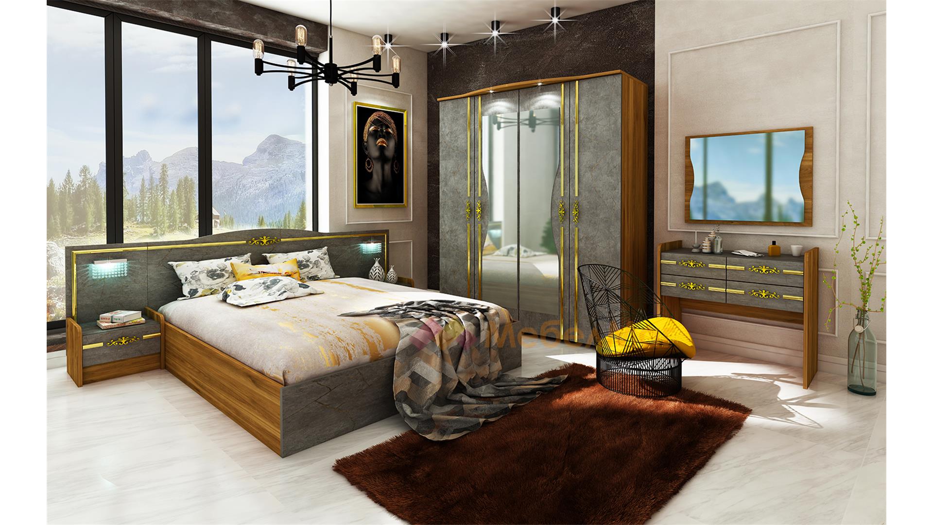 ✓ спалня за матрак 160/200 ✓ LED лампи с кристали на нощните шкафчета ✓ LED осветление на гардероба ✓ ПВЦ златни лайсни ✓ 2 нощни шкафчета ✓ четирикрилен гардероб ✓ скрин тоалетка ✓ плавно затваряне на вратите ✓ модерен декор ✓ качествена изработка ✓ 16 мм ПДЧ