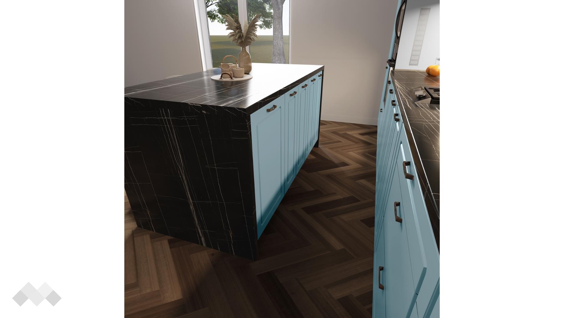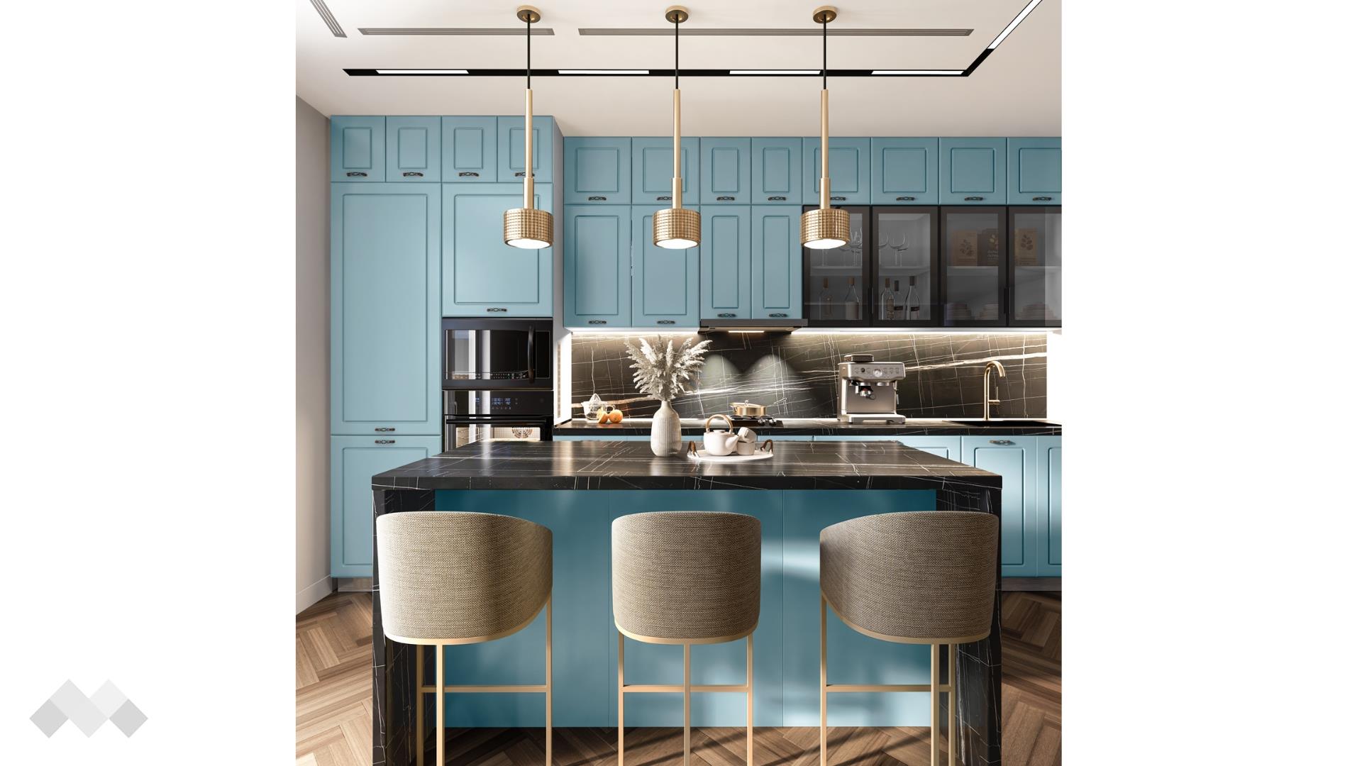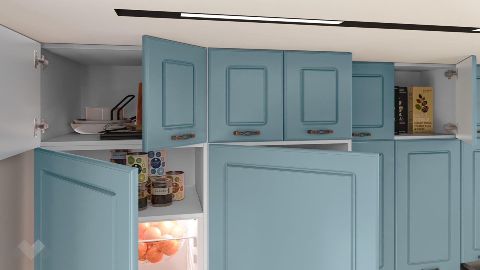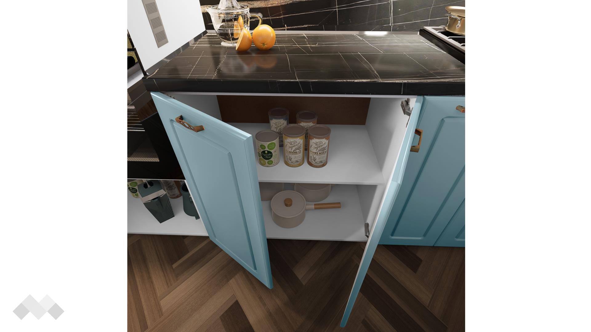 Шкаф стандартен размер за вграждане на хладилник - за да бъде всичко в синхрон. Шкаф за вграждане на фурна и микровълнова. Долния ред шкафове е функционално подбран - перфектната комбинация на рафтове и чекмеджета, за да поберат често използваните уреди, подправки и посуда. Островът - допълнително място за съхранение, още площ за работа и място за сладки приказки и хапване.