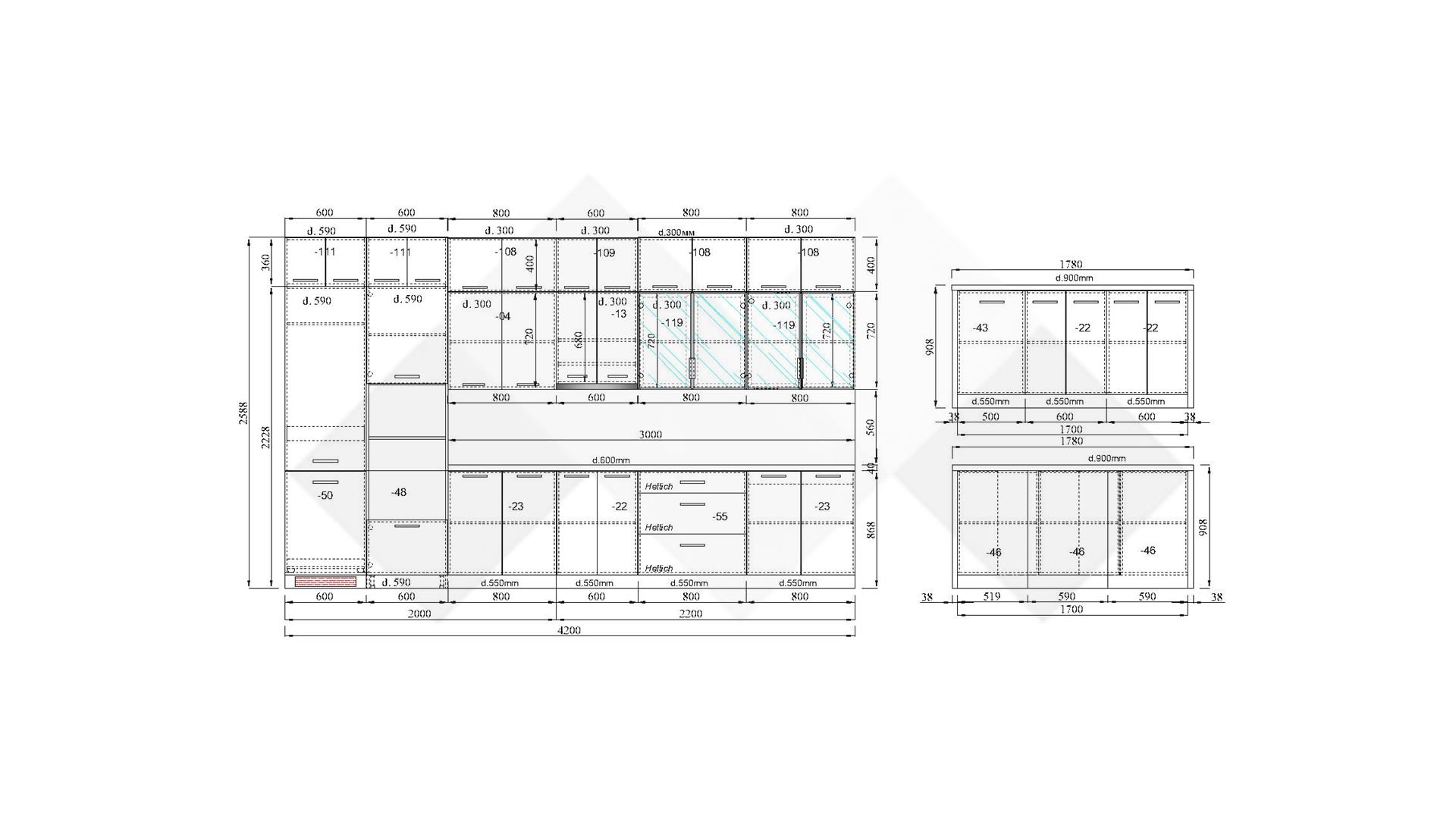 Горния ред шкафове са удобни и функционални - побират малко изполваните уреди и съдове. Основния ред горни шкафове са просторни за най-често използваните уреди и посуда. Витринните шкафове са с опушени матови стъкла 4 мм., за да изглежда още по-елегантно.