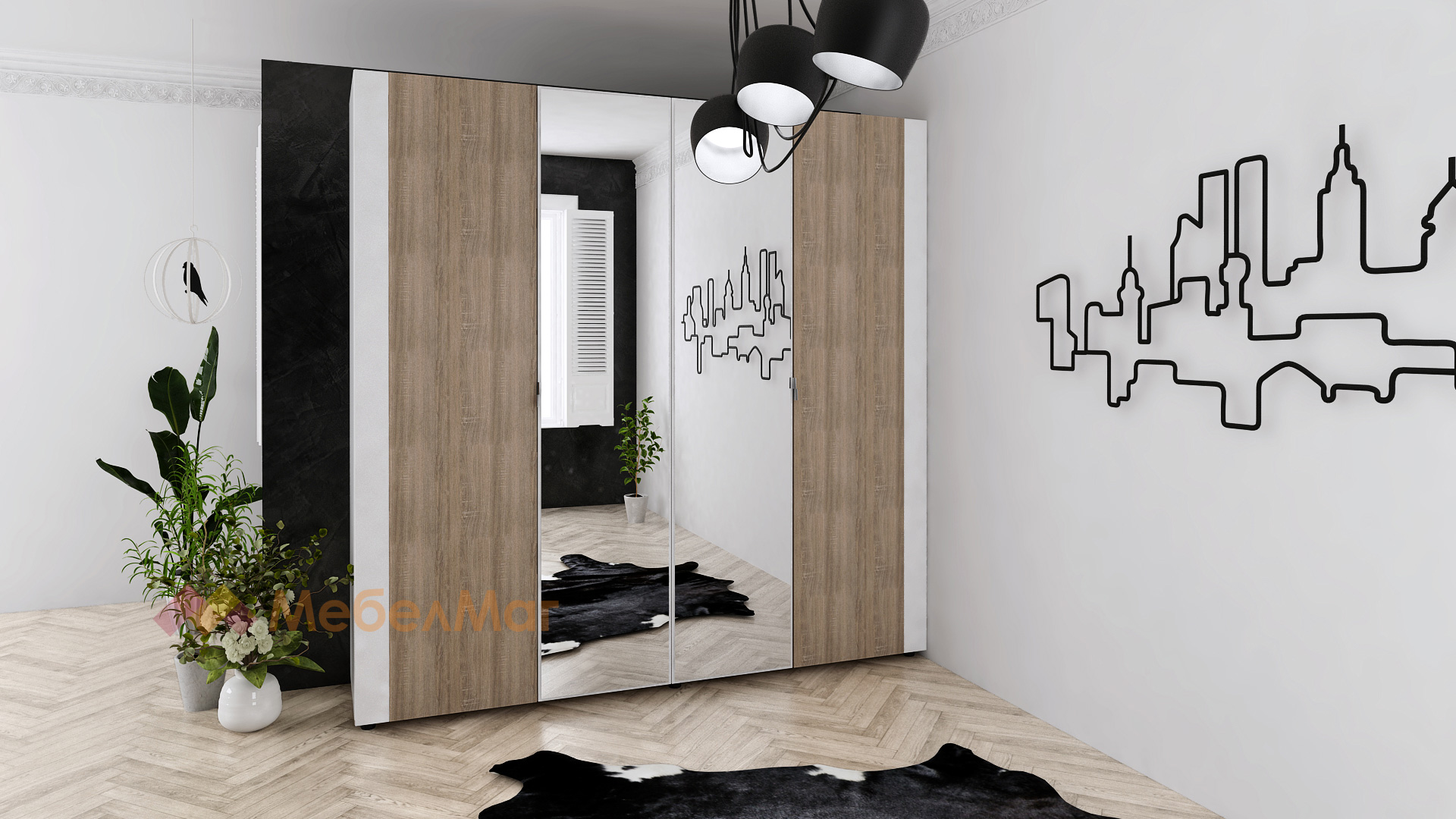 ⭐ Предимства: ✓ четирикрилен ✓ 5 рафта ✓ 2 огледала ✓ лост за закачалки ✓ модерен декор ✓ практично разпределение ✓ качествена изработка ✓ 16 мм ПДЧ