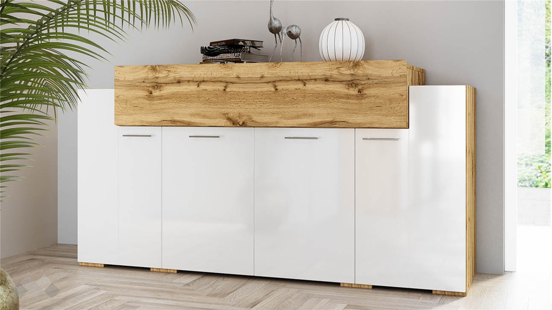 Четирите просторни шкафа с рафтове предоставят достатъчно място, където да подредиш своите дрехи и аксесоари, а качествените механизми и удобни дръжки правят отварянето им лесно и приятно. Допълнителните две ниши с падащи врати ти предоставят място за съхранение на дребни вещи. Плотът отгоре е идеален за подреждане на книги и аксесоари, а ако искаш да подчертаеш индивидуалния си стил, декорирай с изискана дизайнерска аранжировка.