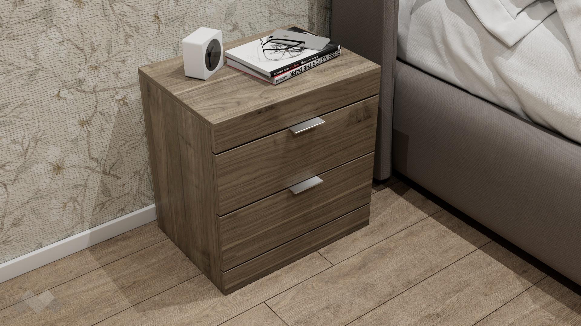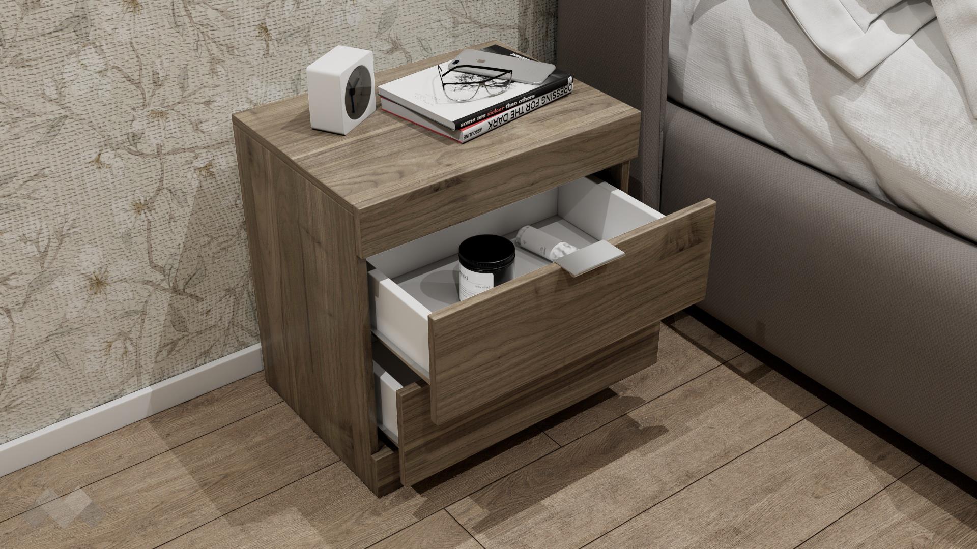 Благодарение на двете чекмеджета лесно ще организираш пространството около леглото. Цветовите комбинации, в които се предлага лесно ще се съчетаят с интериора във всеки един дом. Освен практичен, моделът е изработен от 16 мм ПДЧ, ето защо ще му се наслаждаваш дълго време.