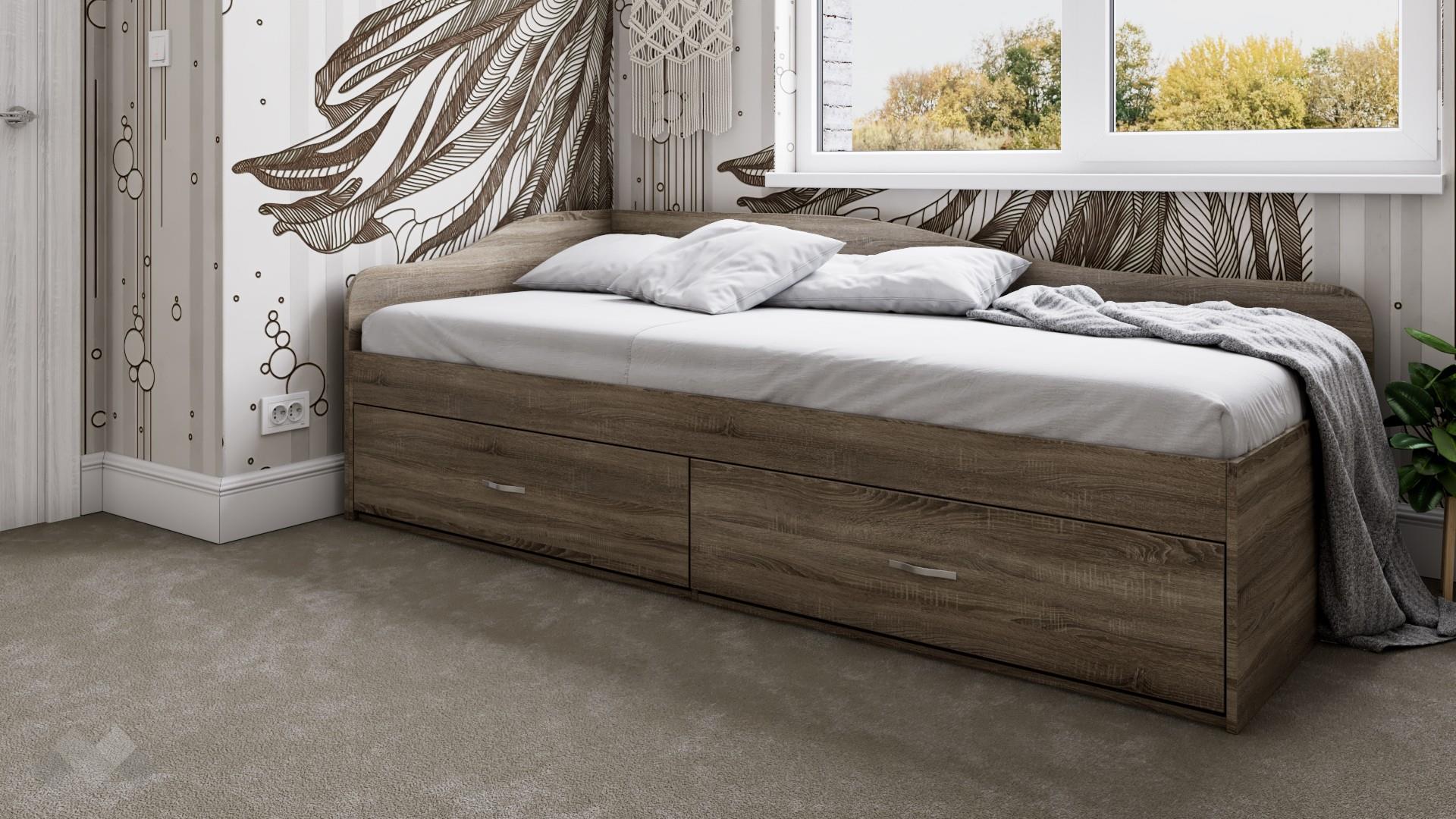 Леглото ще ти осигури необходимото пространство за спокоен и комфортен сън. То е подходящо за матрак с размер 90/200 см. Добавените табли осигуряват пълна изолация от заобикалящите го стени, така че когато си легнеш, ще усещаш единствено комфорта на матрака и мекотата на завивките. В долната част на леглото ще видиш две удобни чекмеджета, където можеш да съхраняваш дрехи, завивки, бельо или други необходими за теб вещи.